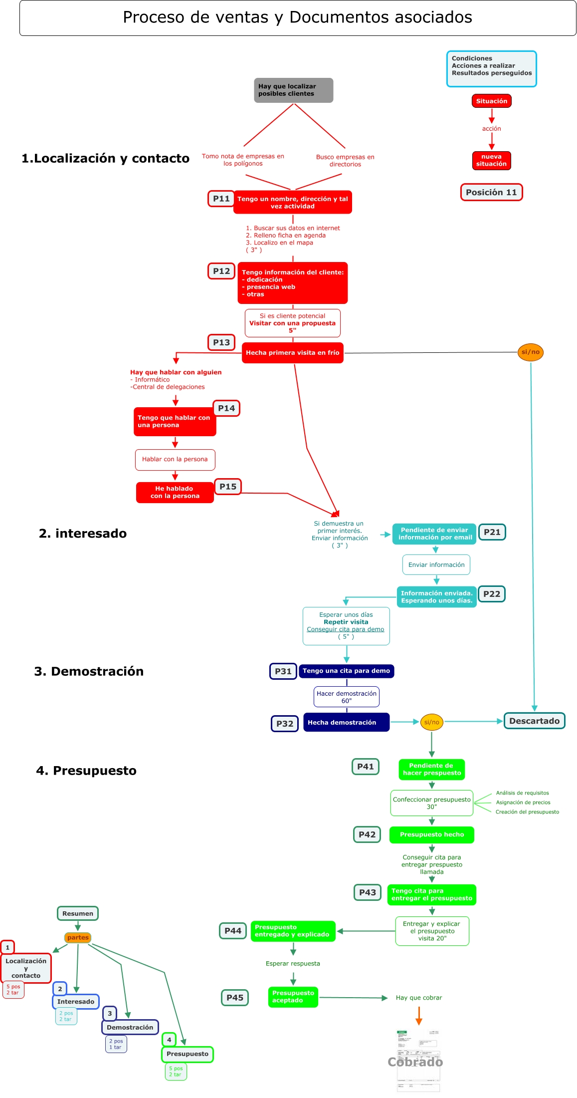 Este Cmap, tiene información relacionada con: Proceso de ventas a clientes. Comercial, Resumen partes Interesado, Presupuesto hecho Conseguir cita para entregar prespuesto llamada Tengo cita para entregar el presupuesto, Hay que localizar posibles clientes Busco empresas en directorios Tengo un nombre, dirección y tal vez actividad, Presupuesto entregado y explicado Esperar respuesta Presupuesto aceptado, Información enviada. Esperando unos días. Esperar unos días Repetir visita Conseguir cita para demo ( 5" ) Tengo una cita para demo, Resumen partes Presupuesto, Hecha demostración si/no Descartado, Tengo cita para entregar el presupuesto Entregar y explicar el presupuesto visita 20" Presupuesto entregado y explicado, Tengo que hablar con una persona Hablar con la persona He hablado con la persona, Resumen partes Localización y contacto, Hecha primera visita en frío si/no Descartado, Tengo un nombre, dirección y tal vez actividad 1. Buscar sus datos en internet 2. Relleno ficha en agenda 3. Localizo en el mapa ( 3" ) Tengo información del cliente: - dedicación - presencia web - otras, Presupuesto aceptado Hay que cobrar Cobrado, Pendiente de hacer prespuesto Confeccionar presupuesto 30" Asignación de precios, Hecha primera visita en frío Si demuestra un primer interés. Enviar información ( 3" ) Pendiente de enviar información por email, Hecha primera visita en frío Hay que hablar con alguien - Informático -Central de delegaciones Tengo que hablar con una persona, Pendiente de hacer prespuesto Confeccionar presupuesto 30" Presupuesto hecho, Resumen partes Demostración, Tengo información del cliente: - dedicación - presencia web - otras Si es cliente potencial Visitar con una propuesta 5" Hecha primera visita en frío, Pendiente de hacer prespuesto Confeccionar presupuesto 30" Creación del presupuesto