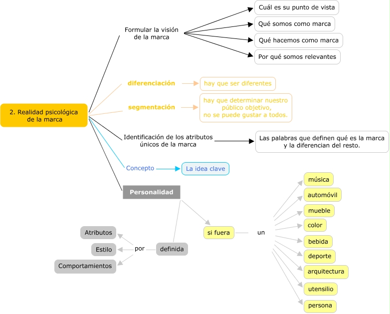 Este Cmap, tiene información relacionada con: Pasos-marca-2-Realidad_psicologica_de_la_marca, 2. Realidad psicológica de la marca Formular la visión de la marca Cuál es su punto de vista, si fuera un deporte, si fuera un automóvil, 2. Realidad psicológica de la marca diferenciación hay que ser diferentes, 2. Realidad psicológica de la marca segmentación hay que determinar nuestro público objetivo, no se puede gustar a todos., si fuera un persona, 2. Realidad psicológica de la marca Personalidad si fuera, definida por Atributos, 2. Realidad psicológica de la marca Formular la visión de la marca Qué hacemos como marca, 2. Realidad psicológica de la marca Formular la visión de la marca Por qué somos relevantes, 2. Realidad psicológica de la marca Identificación de los atributos únicos de la marca Las palabras que definen qué es la marca y la diferencian del resto., si fuera un música, si fuera un color, si fuera un utensilio, 2. Realidad psicológica de la marca Personalidad definida, si fuera un bebida, si fuera un arquitectura, definida por Comportamientos, definida por Estilo, 2. Realidad psicológica de la marca Formular la visión de la marca Qué somos como marca