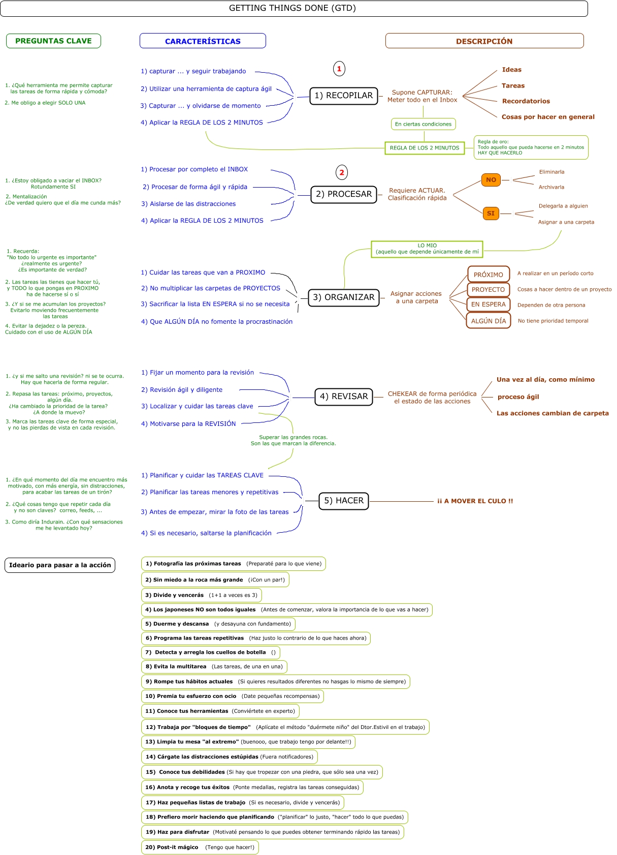 Este Cmap, tiene información relacionada con: GDT-Puntosdeenlace-CosasConcretas, 2) PROCESAR 2) Procesar de forma ágil y rápida, 4) REVISAR 3) Localizar y cuidar las tareas clave, 3) ORGANIZAR Asignar acciones a una carpeta ALGÚN DÍA, 3) ORGANIZAR 3) Sacrificar la lista EN ESPERA si no se necesita, 4) REVISAR CHEKEAR de forma periódica el estado de las acciones proceso ágil, 2) PROCESAR 4) Aplicar la REGLA DE LOS 2 MINUTOS, 1) RECOPILAR Supone CAPTURAR: Meter todo en el Inbox Ideas, 4) REVISAR 4) Motivarse para la REVISIÓN, 1) RECOPILAR 2) Utilizar una herramienta de captura ágil, 1) RECOPILAR Supone CAPTURAR: Meter todo en el Inbox Tareas, 5) HACER 2) Planificar las tareas menores y repetitivas, 5) HACER ¡¡ A MOVER EL CULO !!, 1) RECOPILAR Supone CAPTURAR: Meter todo en el Inbox Cosas por hacer en general, 2) PROCESAR Requiere ACTUAR. Clasificación rápida NO, 3) Localizar y cuidar las tareas clave Superar las grandes rocas. Son las que marcan la diferencia. 1) Planificar y cuidar las TAREAS CLAVE, 2) PROCESAR 1) Procesar por completo el INBOX, 5) HACER 4) Si es necesario, saltarse la planificación, SI Delegarla a alguien, 4) Aplicar la REGLA DE LOS 2 MINUTOS REGLA DE LOS 2 MINUTOS Regla de oro: Todo aquello que pueda hacerse en 2 minutos HAY QUE HACERLO, NO Eliminarla