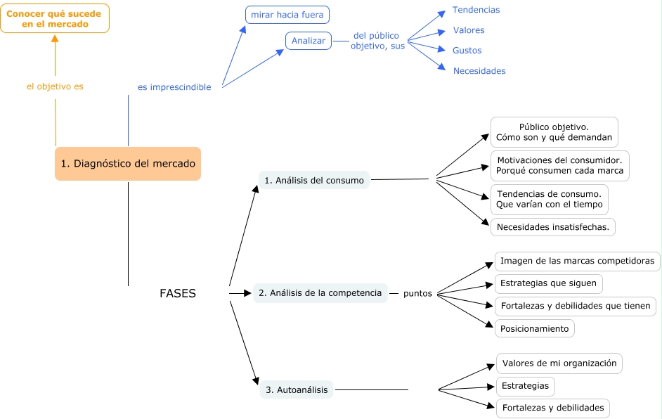 Este Cmap, tiene información relacionada con: Pasos-marca-1-Diagnostico_del_mercado, Analizar del público objetivo, sus Necesidades, 1. Diagnóstico del mercado FASES 1. Análisis del consumo, Analizar del público objetivo, sus Gustos, 3. Autoanálisis Valores de mi organización, 1. Diagnóstico del mercado es imprescindible Analizar, 1. Análisis del consumo Necesidades insatisfechas., 2. Análisis de la competencia puntos Posicionamiento, 1. Análisis del consumo Público objetivo. Cómo son y qué demandan, 2. Análisis de la competencia puntos Estrategias que siguen, 1. Análisis del consumo Motivaciones del consumidor. Porqué consumen cada marca, 3. Autoanálisis Fortalezas y debilidades, 1. Diagnóstico del mercado es imprescindible mirar hacia fuera, 3. Autoanálisis Estrategias, 1. Análisis del consumo Tendencias de consumo. Que varían con el tiempo, 2. Análisis de la competencia puntos Imagen de las marcas competidoras, 2. Análisis de la competencia puntos Fortalezas y debilidades que tienen, Analizar del público objetivo, sus Tendencias, Analizar del público objetivo, sus Valores, 1. Diagnóstico del mercado FASES 2. Análisis de la competencia, 1. Diagnóstico del mercado el objetivo es Conocer qué sucede en el mercado