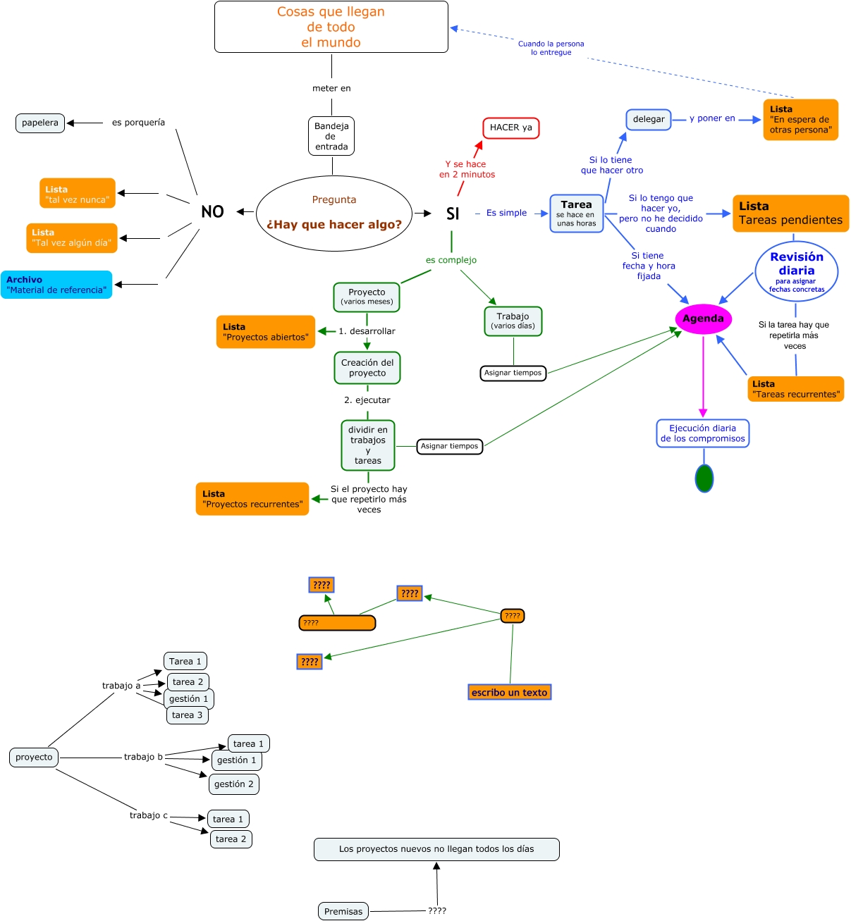 Este Cmap, tiene información relacionada con: GTD-el proceso, Bandeja de entrada Pregunta ¿Hay que hacer algo? NO, Agenda Ejecución diaria de los compromisos, proyecto trabajo b gestión 1, Lista Tareas pendientes Revisión diaria para asignar fechas concretas Si la tarea hay que repetirla más veces, proyecto trabajo b tarea 1, SI Y se hace en 2 minutos HACER ya, Bandeja de entrada Pregunta ¿Hay que hacer algo? SI, SI Es simple Tarea se hace en unas horas, proyecto trabajo c tarea 1, Lista "En espera de otras persona" Cuando la persona lo entregue Cosas que llegan de todo el mundo, SI es complejo Trabajo (varios días), NO Archivo "Material de referencia", Creación del proyecto 2. ejecutar dividir en trabajos y tareas, NO Lista "tal vez nunca", delegar y poner en Lista "En espera de otras persona", proyecto trabajo a tarea 2, proyecto trabajo b gestión 2, Premisas ???? Los proyectos nuevos no llegan todos los días, Proyecto (varios meses) 1. desarrollar Lista "Proyectos abiertos", Tarea se hace en unas horas Si tiene fecha y hora fijada Agenda