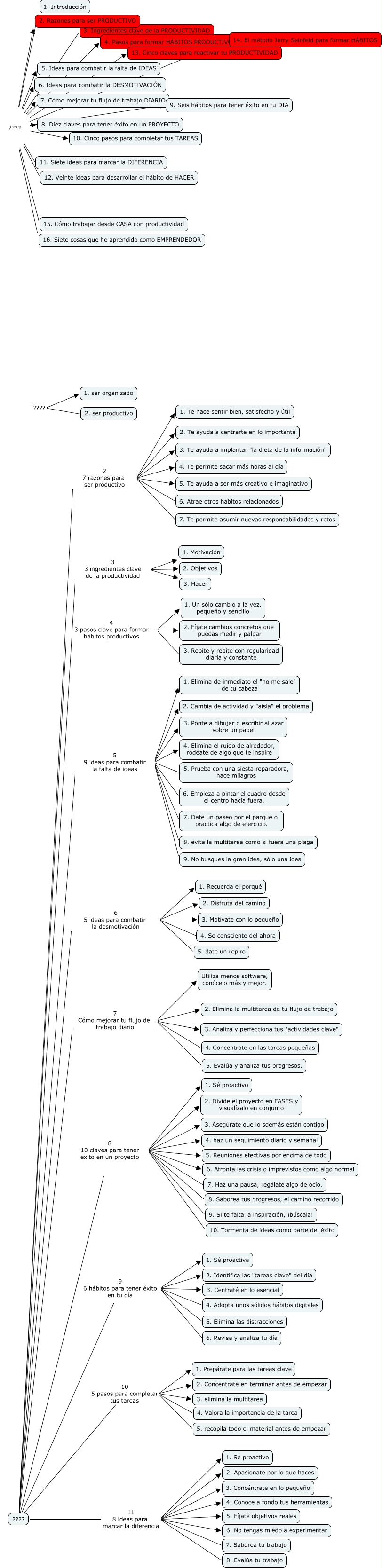 Este Cmap, tiene información relacionada con: ThinkWasabi-Escrito-EresProductivo, ???? 9 6 hábitos para tener éxito en tu día 6. Revisa y analiza tu día, ???? 8 10 claves para tener exito en un proyecto 7. Haz una pausa, regálate algo de ocio., ???? 2 7 razones para ser productivo 2. Te ayuda a centrarte en lo importante, ???? 9 6 hábitos para tener éxito en tu día 4. Adopta unos sólidos hábitos digitales, ???? 6 5 ideas para combatir la desmotivación 5. date un repiro, ???? 5 9 ideas para combatir la falta de ideas 4. Elimina el ruido de alrededor, rodéate de algo que te inspire, ???? 2 7 razones para ser productivo 7. Te permite asumir nuevas responsabilidades y retos, ???? 11 8 ideas para marcar la diferencia 8. Evalúa tu trabajo, 2. ser productivo ???? 1. ser organizado, ???? 6 5 ideas para combatir la desmotivación 1. Recuerda el porqué, ???? 8 10 claves para tener exito en un proyecto 1. Sé proactivo, ???? 8 10 claves para tener exito en un proyecto 5. Reuniones efectivas por encima de todo, 3. Ingredientes clave de la PRODUCTIVIDAD ???? 8. Diez claves para tener éxito en un PROYECTO, ???? 11 8 ideas para marcar la diferencia 7. Saborea tu trabajo, ???? 10 5 pasos para completar tus tareas 1. Prepárate para las tareas clave, ???? 11 8 ideas para marcar la diferencia 5. Fíjate objetivos reales, ???? 5 9 ideas para combatir la falta de ideas 5. Prueba con una siesta reparadora, hace milagros, ???? 8 10 claves para tener exito en un proyecto 3. Asegúrate que lo sdemás están contigo, ???? 6 5 ideas para combatir la desmotivación 3. Motívate con lo pequeño, ???? 9 6 hábitos para tener éxito en tu día 3. Centraté en lo esencial