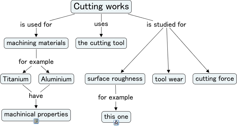 このコンセプトマップに関連する情報: Cutting works(workingspace1), Cutting works is used for machining materials, Cutting works is studied for tool wear, Cutting works uses the cutting tool, Aluminium have machinical properties, surface roughness for example this one, Cutting works is studied for surface roughness, Titanium have machinical properties, machining materials for example Titanium, machining materials for example Aluminium, Cutting works is studied for cutting force