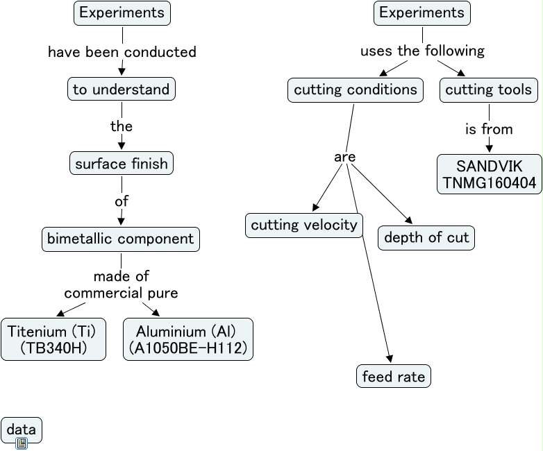 This Concept Map, created with IHMC CmapTools, has information related to: experimental data, cutting tools is from SANDVIK TNMG160404, bimetallic component made of commercial pure Aluminium (Al) (A1050BE-H112), cutting conditions are depth of cut, surface finish of bimetallic component, Experiments uses the following cutting conditions, to understand the surface finish, cutting conditions are cutting velocity, Experiments uses the following cutting tools, bimetallic component made of commercial pure Titenium (Ti) (TB340H), Experiments have been conducted to understand, cutting conditions are feed rate