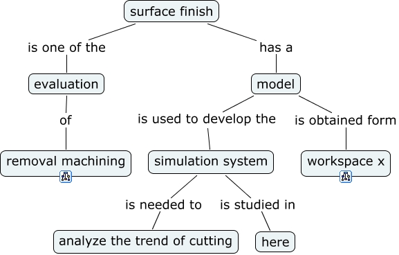 このコンセプトマップに関連する情報: model of surface finish, simulation system is studied in here, model is obtained form workspace x, model is used to develop the simulation system, surface finish has a model, evaluation of removal machining, simulation system is needed to analyze the trend of cutting, surface finish is one of the evaluation