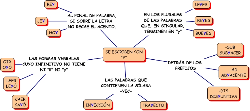 Este Cmap, tiene información relacionada con: USO DE LA Y, SE ESCRIBEN CON "Y" EN LOS PLURALES DE LAS PALABRAS QUE, EN SINGULAR, TERMINEN EN "y" LEYES, SE ESCRIBEN CON "Y" LAS PALABRAS QUE CONTIENEN LA SÍLABA -YEC- TRAYECTO, SE ESCRIBEN CON "Y" LAS FORMAS VERBALES CUYO INFINITIVO NO TIENE NI "ll" NI "y" CAER CAYÓ, SE ESCRIBEN CON "Y" AL FINAL DE PALABRA, SI SOBRE LA LETRA NO RECAE EL ACENTO. LEY, SE ESCRIBEN CON "Y" EN LOS PLURALES DE LAS PALABRAS QUE, EN SINGULAR, TERMINEN EN "y" REYES, SE ESCRIBEN CON "Y" AL FINAL DE PALABRA, SI SOBRE LA LETRA NO RECAE EL ACENTO. HOY, SE ESCRIBEN CON "Y" DETRÁS DE LOS PREFIJOS -SUB SUBYACER, SE ESCRIBEN CON "Y" LAS FORMAS VERBALES CUYO INFINITIVO NO TIENE NI "ll" NI "y" OIR OYÓ, SE ESCRIBEN CON "Y" EN LOS PLURALES DE LAS PALABRAS QUE, EN SINGULAR, TERMINEN EN "y" BUEYES, SE ESCRIBEN CON "Y" LAS PALABRAS QUE CONTIENEN LA SÍLABA -YEC- INYECCIÓN, SE ESCRIBEN CON "Y" DETRÁS DE LOS PREFIJOS -AD ADYACENTE, SE ESCRIBEN CON "Y" AL FINAL DE PALABRA, SI SOBRE LA LETRA NO RECAE EL ACENTO. REY, SE ESCRIBEN CON "Y" DETRÁS DE LOS PREFIJOS -DIS DISYUNTIVA, SE ESCRIBEN CON "Y" LAS FORMAS VERBALES CUYO INFINITIVO NO TIENE NI "ll" NI "y" LEER LEYÓ