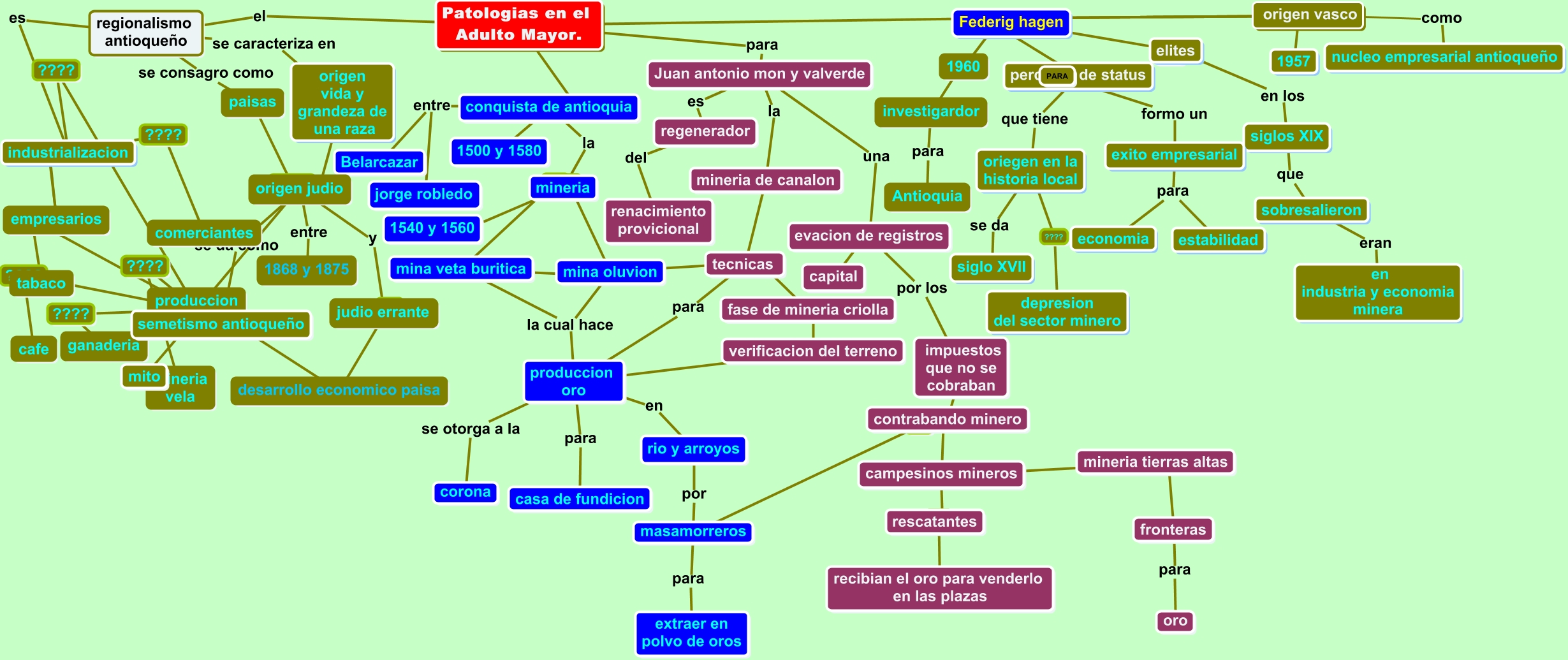 Este Cmap, tiene información relacionada con: m´pa conceptual antioquia, contrabando minero ???? campesinos mineros, Patologias en el Adulto Mayor. PARA origen vasco, mina oluvion y mina veta buritica, produccion oro para casa de fundicion, Juan antonio mon y valverde una evacion de registros, impuestos que no se cobraban ademas contrabando minero, mineria ???? mina veta buritica, Patologias en el Adulto Mayor. para Juan antonio mon y valverde, masamorreros para extraer en polvo de oros, siglos XIX que sobresalieron, rescatantes ???? recibian el oro para venderlo en las plazas, produccion oro en rio y arroyos, mineria de canalon eran tecnicas, industrializacion ???? produccion industrial, industrializacion ???? empresarios, mineria tierras altas ???? fronteras, produccion industrial ???? ganaderia, Patologias en el Adulto Mayor. PARA perdidad de status, regionalismo antioqueño es industrializacion, masamorreros por rio y arroyos