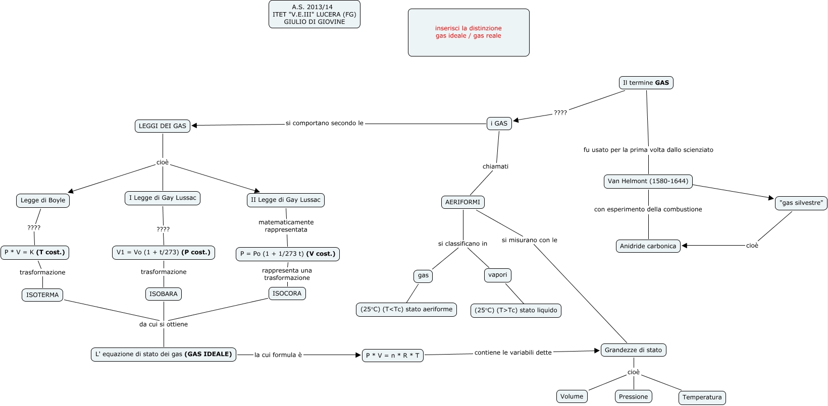 Questa Cmap, creata con IHMC CmapTools, contiene informazioni relative a: I GAS, AERIFORMI si classificano in gas, Van Helmont (1580-1644) con esperimento della combustione Anidride carbonica, P = Po (1 + 1/273 t) (V cost.) rappresenta una trasformazione ISOCORA, ISOTERMA da cui si ottiene L' equazione di stato dei gas (GAS IDEALE), AERIFORMI si classificano in vapori, Il termine GAS ???? i GAS, P * V = K (T cost.) trasformazione ISOTERMA, i GAS si comportano secondo le LEGGI DEI GAS, ISOCORA da cui si ottiene L' equazione di stato dei gas (GAS IDEALE), vapori ???? (25°C) (T>Tc) stato liquido, Grandezze di stato cioè Volume, LEGGI DEI GAS cioè I Legge di Gay Lussac, Grandezze di stato cioè Temperatura, gas ???? (25°C) (T<Tc) stato aeriforme, ISOBARA da cui si ottiene L' equazione di stato dei gas (GAS IDEALE), Grandezze di stato cioè Pressione, LEGGI DEI GAS cioè II Legge di Gay Lussac, Van Helmont (1580-1644) ???? "gas silvestre", Grandezze di stato cioè Pressione, P * V = n * R * T contiene le variabili dette Grandezze di stato