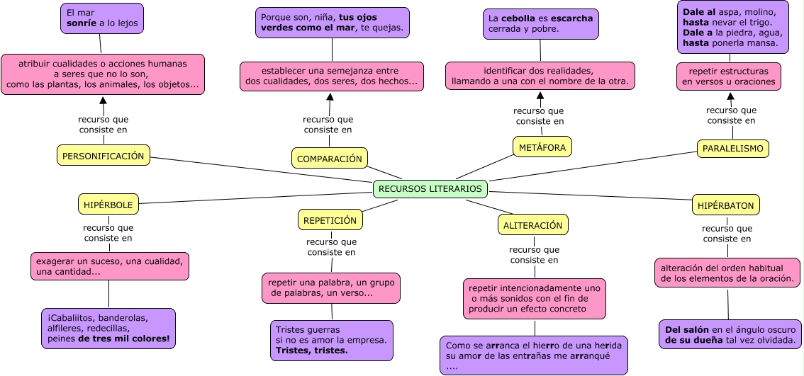 Este Cmap, tiene información relacionada con: GÉNEROS LITERARIOS recursos literarios, identificar dos realidades, llamando a una con el nombre de la otra. ???? La cebolla es escarcha cerrada y pobre., atribuir cualidades o acciones humanas a seres que no lo son, como las plantas, los animales, los objetos... ???? El mar sonríe a lo lejos, RECURSOS LITERARIOS ???? REPETICIÓN, HIPÉRBATON recurso que consiste en alteración del orden habitual de los elementos de la oración., repetir estructuras en versos u oraciones ???? Dale al aspa, molino, hasta nevar el trigo. Dale a la piedra, agua, hasta ponerla mansa., RECURSOS LITERARIOS ???? ALITERACIÓN, COMPARACIÓN recurso que consiste en establecer una semejanza entre dos cualidades, dos seres, dos hechos..., HIPÉRBOLE recurso que consiste en exagerar un suceso, una cualidad, una cantidad..., RECURSOS LITERARIOS ???? HIPÉRBATON, METÁFORA recurso que consiste en identificar dos realidades, llamando a una con el nombre de la otra., PERSONIFICACIÓN recurso que consiste en atribuir cualidades o acciones humanas a seres que no lo son, como las plantas, los animales, los objetos..., RECURSOS LITERARIOS ???? METÁFORA, exagerar un suceso, una cualidad, una cantidad... ???? ¡Cabaliitos, banderolas, alfileres, redecillas, peines de tres mil colores!, REPETICIÓN recurso que consiste en repetir una palabra, un grupo de palabras, un verso..., establecer una semejanza entre dos cualidades, dos seres, dos hechos... ???? Porque son, niña, tus ojos verdes como el mar, te quejas., PARALELISMO recurso que consiste en repetir estructuras en versos u oraciones, RECURSOS LITERARIOS ???? COMPARACIÓN, RECURSOS LITERARIOS ???? HIPÉRBOLE, repetir una palabra, un grupo de palabras, un verso... ???? Tristes guerras si no es amor la empresa. Tristes, tristes., RECURSOS LITERARIOS ???? PERSONIFICACIÓN