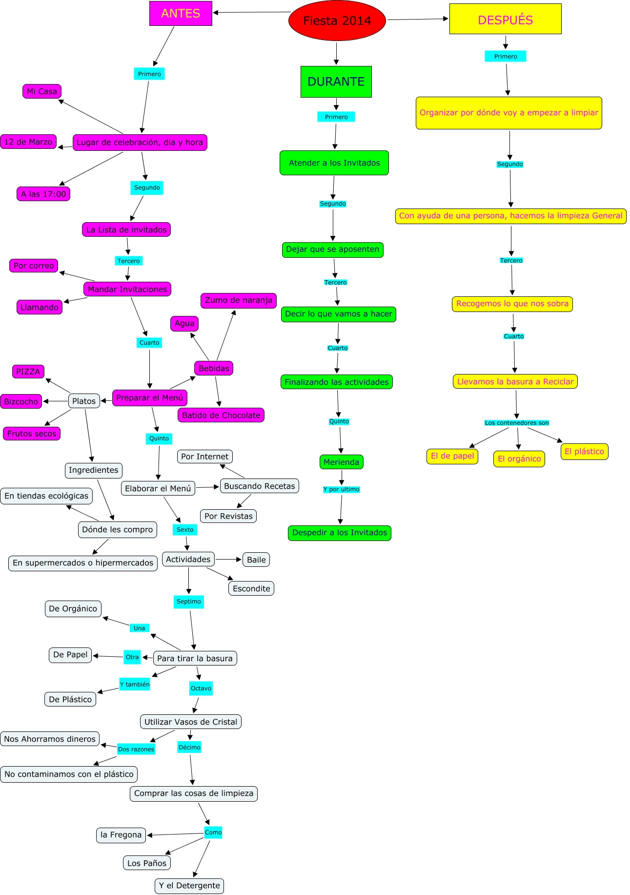 Este Cmap, tiene información relacionada con: Mi fiesta 2014, Mandar Invitaciones Cuarto Preparar el Menú, Decir lo que vamos a hacer Cuarto Finalizando las actividades, Platos Ingredientes, Comprar las cosas de limpieza Como Y el Detergente, Lugar de celebración, dia y hora 12 de Marzo, Elaborar el Menú Sexto Actividades, Dejar que se aposenten Tercero Decir lo que vamos a hacer, Lugar de celebración, dia y hora Segundo La Lista de invitados, Utilizar Vasos de Cristal Dos razones No contaminamos con el plástico, Buscando Recetas Por Internet, Bebidas Zumo de naranja, Llevamos la basura a Reciclar Los contenedores son El plástico, Llevamos la basura a Reciclar Los contenedores son El de papel, Comprar las cosas de limpieza Como la Fregona, Organizar por dónde voy a empezar a limpiar Segundo Con ayuda de una persona, hacemos la limpieza General, Preparar el Menú Platos, Fiesta 2014 ANTES, DURANTE Primero Atender a los Invitados, Elaborar el Menú Buscando Recetas, Platos Frutos secos