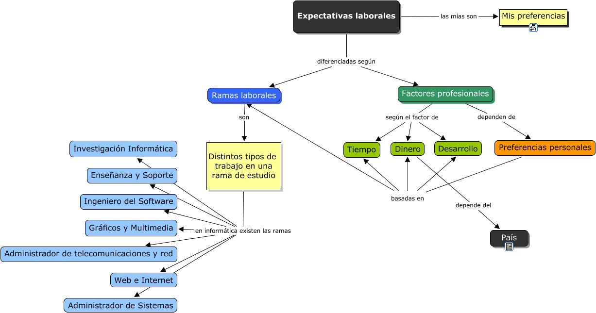 Este Cmap, tiene información relacionada con: Practica1, Preferencias personales basadas en Tiempo, Distintos tipos de trabajo en una rama de estudio en informática existen las ramas Web e Internet, Preferencias personales basadas en Desarrollo, Factores profesionales según el factor de Dinero, Distintos tipos de trabajo en una rama de estudio en informática existen las ramas Ingeniero del Software, Factores profesionales dependen de Preferencias personales, Factores profesionales según el factor de Desarrollo, Distintos tipos de trabajo en una rama de estudio en informática existen las ramas Enseñanza y Soporte, Dinero depende del País, Preferencias personales basadas en Dinero, Expectativas laborales diferenciadas según Ramas laborales, Distintos tipos de trabajo en una rama de estudio en informática existen las ramas Administrador de telecomunicaciones y red, Expectativas laborales diferenciadas según Factores profesionales, Ramas laborales son Distintos tipos de trabajo en una rama de estudio, Distintos tipos de trabajo en una rama de estudio en informática existen las ramas Gráficos y Multimedia, Distintos tipos de trabajo en una rama de estudio en informática existen las ramas Investigación Informática, Distintos tipos de trabajo en una rama de estudio en informática existen las ramas Administrador de Sistemas, Factores profesionales según el factor de Tiempo, Preferencias personales basadas en Ramas laborales, Expectativas laborales las mías son Mis preferencias