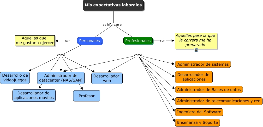 Este Cmap, tiene información relacionada con: Practica1-2, Profesionales son Aquellas para la que la carrera me ha preparado, Profesionales como Administrador de Bases de datos, Profesionales como Administrador de telecomunicaciones y red, Profesionales como Administrador de sistemas, Mis expectativas laborales se bifurcan en Personales, Profesionales como Administrador de datacenter (NAS/SAN), Personales como Desarrollo de videojuegos, Profesionales como Ingeniero del Software, Personales como Desarrollador de aplicaciones móviles, Personales son Aquellas que me gustaría ejercer, Profesionales como Desarrollador web, Personales como Profesor, Personales como Desarrollador web, Profesionales como Desarrollador de aplicaciones, Personales como Administrador de datacenter (NAS/SAN), Profesionales como Enseñanza y Soporte, Mis expectativas laborales se bifurcan en Profesionales
