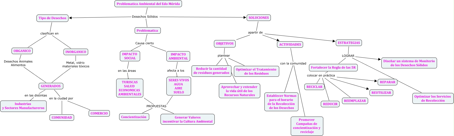 Este Cmap, tiene información relacionada con: CULTURA II AMBIENTE, Tipo de Desechos clasifican en INORGANICO, Problematica Ambiental del Edo Mérida Desechos Sólidos Tipo de Desechos, ORGANICO Desechos Animales Alimentos GENERADOS, GENERADOS en la ciudad por COMUNIDAD, TURISCAS SALUD ECONOMICAS AMBIENTALES PROPUESTAS Concientización, GENERADOS en las distintas Industrias y Sectores Manufactureros, Problematica Causa cierto IMPACTO SOCIAL, ACTIVIDADES con la comunidad Promover Campañas de concientización y reciclaje, Fortalecer la Regla de las 5R colocar en práctica RECICLAR, SERES VIVOS AGUA AIRE SUELO PROPUESTAS Concientización, Fortalecer la Regla de las 5R colocar en práctica REPARAR, INORGANICO Metal, vidrio materiales tóxicos GENERADOS, ESTRATEGIAS LOGRAR Fortalecer la Regla de las 5R, SERES VIVOS AGUA AIRE SUELO PROPUESTAS Generar Valores incentivar la Cultura Ambiental, TURISCAS SALUD ECONOMICAS AMBIENTALES PROPUESTAS Generar Valores incentivar la Cultura Ambiental, SOLUCIONES apartir de ESTRATEGIAS, OBJETIVOS plantear Optimizar el Tratamiento de los Residuos, Tipo de Desechos clasifican en ORGANICO, GENERADOS en la ciudad por COMERCIO, ESTRATEGIAS LOGRAR Diseñar un sistema de Moniterio de los Desechos Sólidos
