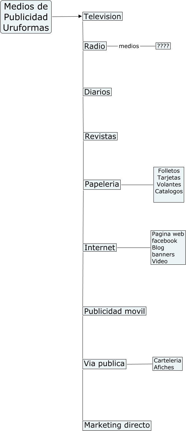 Este Cmap, tiene información relacionada con: MediosPublicidad, Diarios Revistas, Television Radio, Via publica Carteleria Afiches, Internet Pagina web facebook Blog banners Video, Papeleria Folletos Tarjetas Volantes Catalogos, Internet Publicidad movil, Papeleria Internet, Publicidad movil Via publica, Medios de Publicidad Uruformas Television, Via publica Marketing directo, Radio Diarios, Radio medios ????, Revistas Papeleria