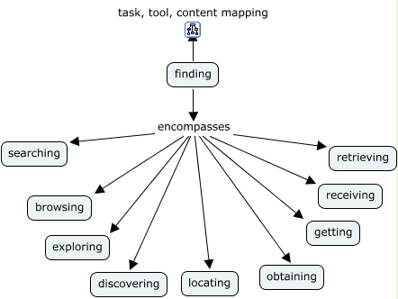This Concept Map, created with IHMC CmapTools, has information related to: finding, finding encompasses exploring, finding encompasses searching, finding encompasses locating, finding encompasses getting, finding encompasses obtaining, finding encompasses discovering, finding encompasses browsing, finding encompasses retrieving, finding task, tool, content mapping, finding encompasses receiving