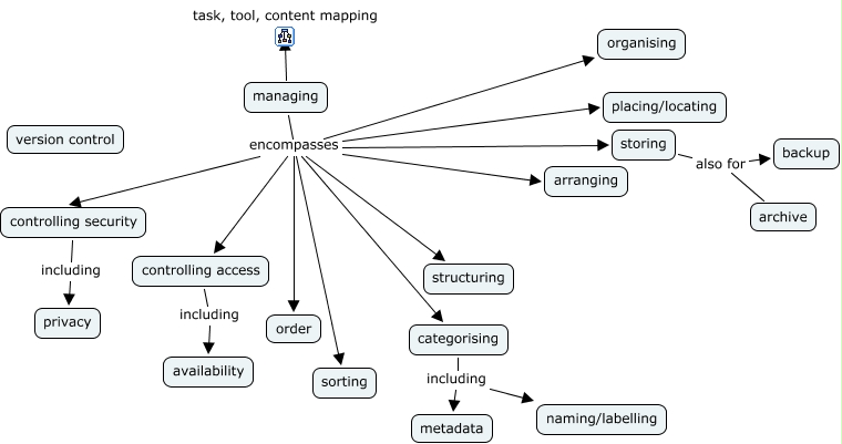 This Concept Map, created with IHMC CmapTools, has information related to: managing, storing also for archive, controlling security including privacy, managing encompasses controlling security, managing encompasses organising, managing encompasses structuring, categorising including metadata, managing task, tool, content mapping, categorising including naming/labelling, managing encompasses placing/locating, managing encompasses sorting, managing encompasses arranging, controlling access including availability, managing encompasses controlling access, storing also for backup, managing encompasses storing, managing encompasses categorising, managing encompasses order