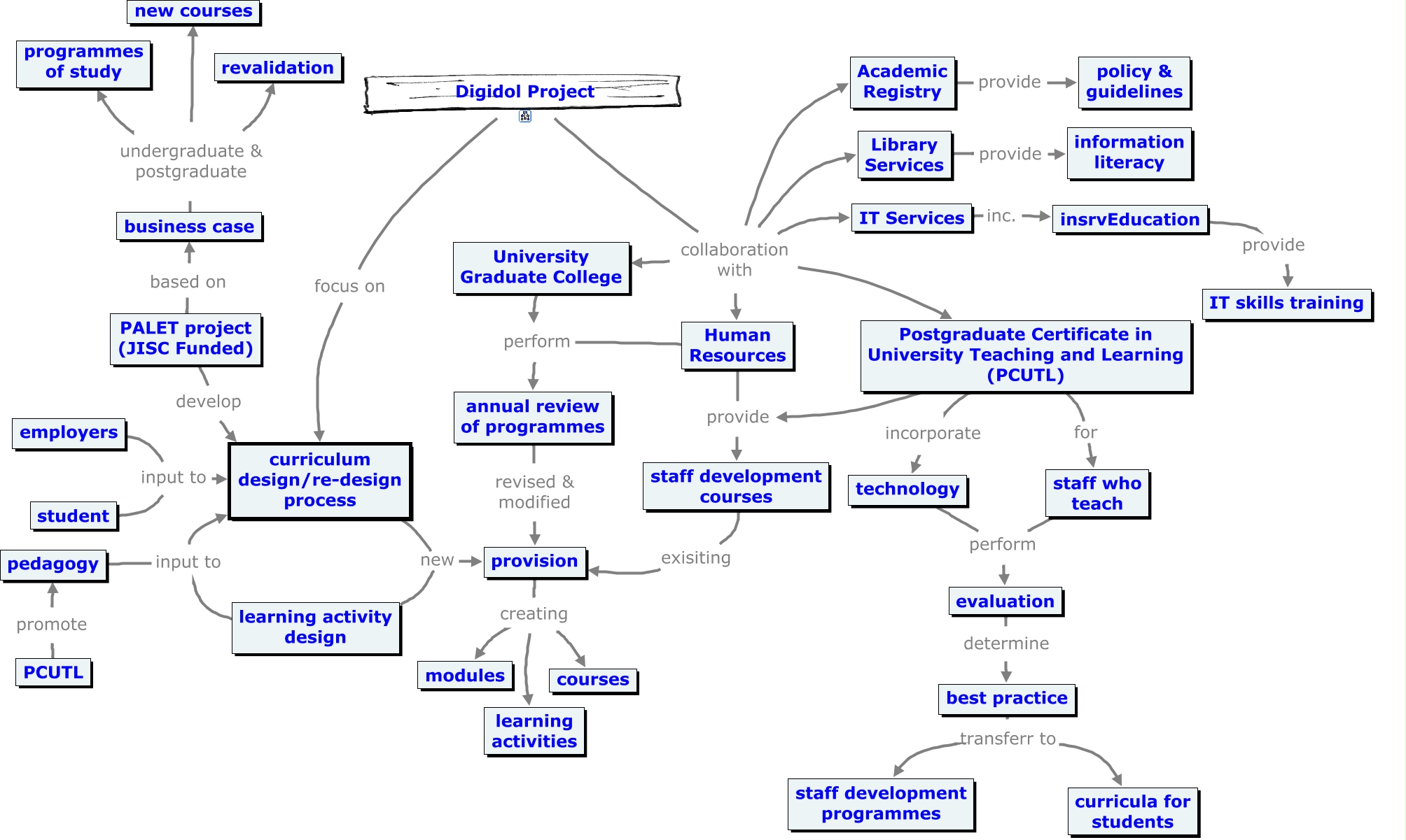 This Concept Map, created with IHMC CmapTools, has information related to: services_and_processes, business case undergraduate & postgraduate revalidation, PALET project (JISC Funded) based on business case, employers input to curriculum design/re-design process, Postgraduate Certificate in University Teaching and Learning (PCUTL) provide staff development courses, annual review of programmes revised & modified provision, best practice transferr to staff development programmes, curriculum design/re-design process new provision, Postgraduate Certificate in University Teaching and Learning (PCUTL) for staff who teach, learning activity design new provision, Postgraduate Certificate in University Teaching and Learning (PCUTL) incorporate technology, Digidol Project collaboration with University Graduate College, evaluation determine best practice, IT Services inc. insrvEducation, Academic Registry provide policy & guidelines, Human Resources provide staff development courses, PCUTL promote pedagogy, Digidol Project focus on curriculum design/re-design process, University Graduate College perform annual review of programmes, Digidol Project collaboration with Library Services, best practice transferr to curricula for students