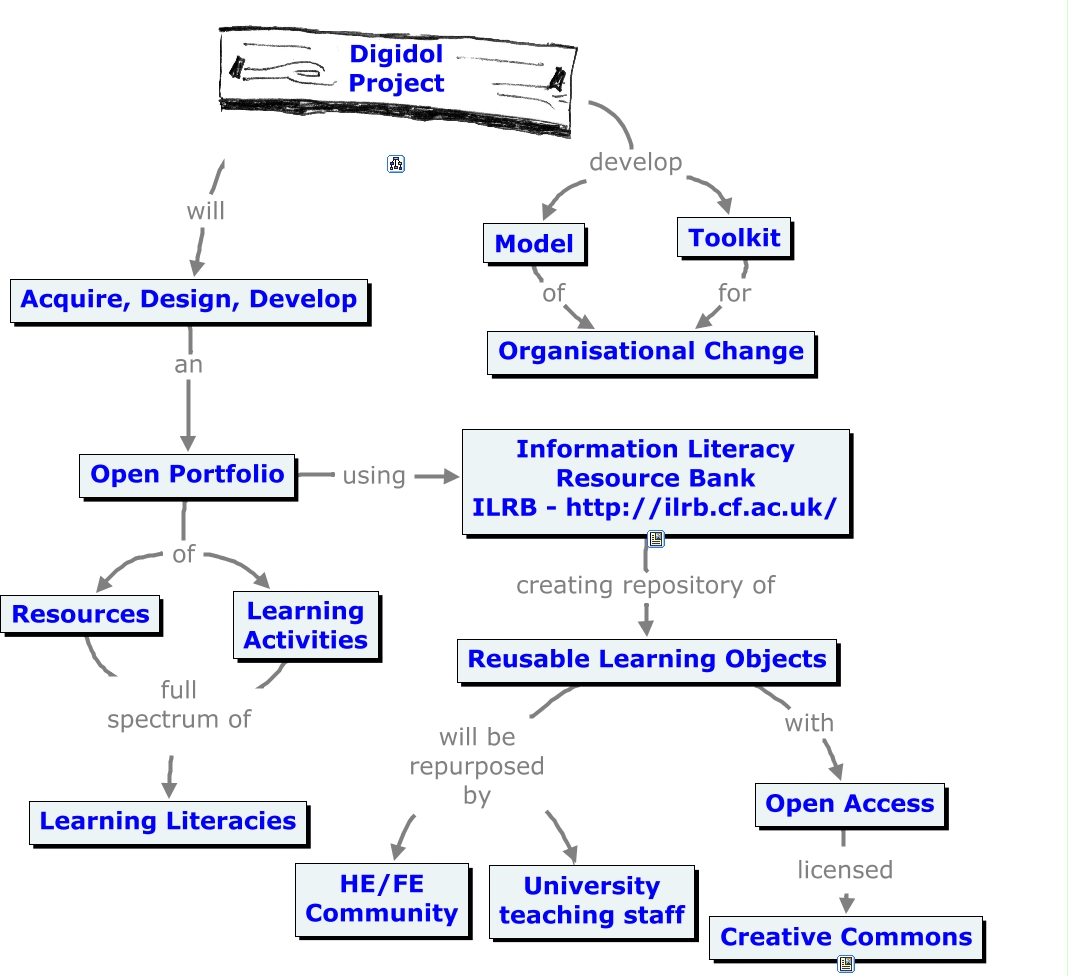 This Concept Map, created with IHMC CmapTools, has information related to: outputs, Open Portfolio using Information Literacy Resource Bank ILRB - http://ilrb.cf.ac.uk/, Reusable Learning Objects will be repurposed by University teaching staff, Digidol Project will Acquire, Design, Develop, Open Access licensed Creative Commons, Learning Activities full spectrum of Learning Literacies, Model of Organisational Change, Digidol Project develop Toolkit, Acquire, Design, Develop an Open Portfolio, Resources full spectrum of Learning Literacies, Open Portfolio of Resources, Information Literacy Resource Bank ILRB - http://ilrb.cf.ac.uk/ creating repository of Reusable Learning Objects, Reusable Learning Objects with Open Access, Reusable Learning Objects will be repurposed by HE/FE Community, Toolkit for Organisational Change, Digidol Project develop Model, Open Portfolio of Learning Activities