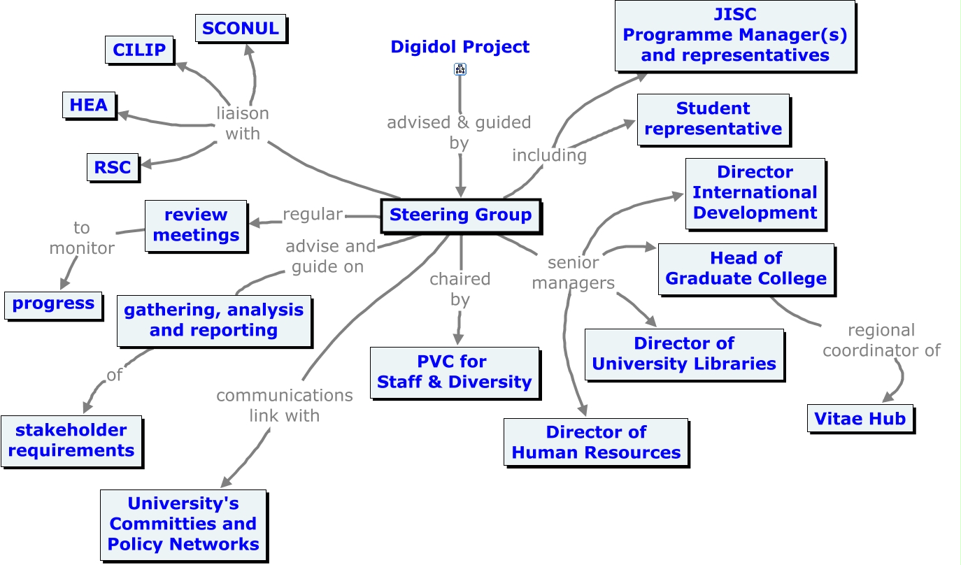 This Concept Map, created with IHMC CmapTools, has information related to: steering_group, Digidol Project advised & guided by Steering Group, Steering Group senior managers Director International Development, Steering Group senior managers Director of Human Resources, Head of Graduate College regional coordinator of Vitae Hub, Steering Group including Student representative, Steering Group regular review meetings, Steering Group communications link with University's Committies and Policy Networks, gathering, analysis and reporting of stakeholder requirements, Steering Group chaired by PVC for Staff & Diversity, Steering Group liaison with HEA, Steering Group senior managers Head of Graduate College, review meetings to monitor progress, Steering Group liaison with SCONUL, Steering Group liaison with CILIP, Steering Group liaison with RSC, Steering Group senior managers Director of University Libraries, Steering Group including JISC Programme Manager(s) and representatives, Steering Group advise and guide on gathering, analysis and reporting