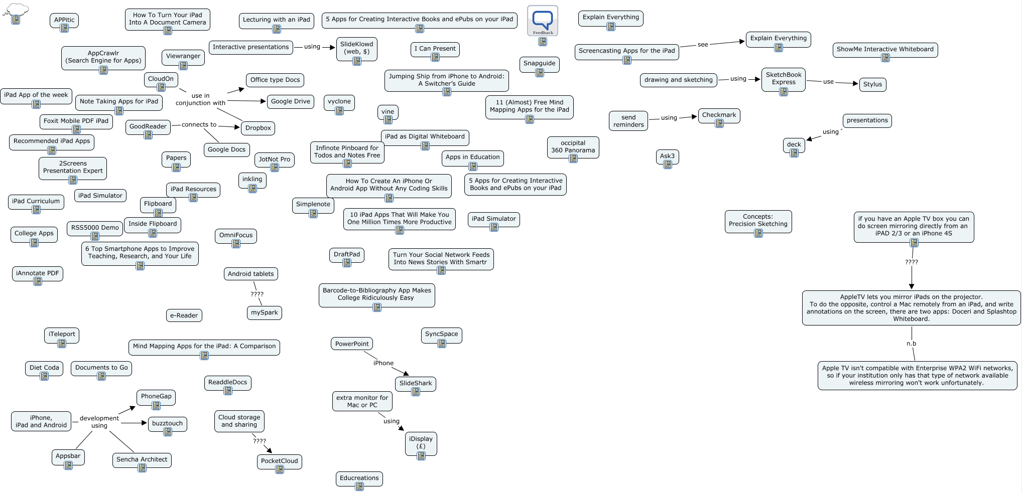 This Concept Map, created with IHMC CmapTools, has information related to: Tablets, iPad, iPhone and Smartphones, AppleTV lets you mirror iPads on the projector. To do the opposite, control a Mac remotely from an iPad, and write annotations on the screen, there are two apps: Doceri and Splashtop Whiteboard. n.b Apple TV isn't compatible with Enterprise WPA2 WiFi networks, so if your institution only has that type of network available wireless mirroring won't work unfortunately., iPhone, iPad and Android development using buzztouch, iPhone, iPad and Android development using PhoneGap, GoodReader connects to Dropbox, send reminders using Checkmark, CloudOn use in conjunction with Google Drive, SketchBook Express use Stylus, if you have an Apple TV box you can do screen mirroring directly from an iPAD 2/3 or an iPhone 4S ???? AppleTV lets you mirror iPads on the projector. To do the opposite, control a Mac remotely from an iPad, and write annotations on the screen, there are two apps: Doceri and Splashtop Whiteboard., Interactive presentations using SlideKlowd (web, $), PowerPoint iPhone SlideShark, Screencasting Apps for the iPad see Explain Everything, CloudOn use in conjunction with Office type Docs, Cloud storage and sharing ???? PocketCloud, drawing and sketching using SketchBook Express, Android tablets ???? mySpark, CloudOn use in conjunction with Dropbox, iPhone, iPad and Android development using Appsbar, extra monitor for Mac or PC using iDisplay (£), iPhone, iPad and Android development using Sencha Architect, GoodReader connects to Google Docs
