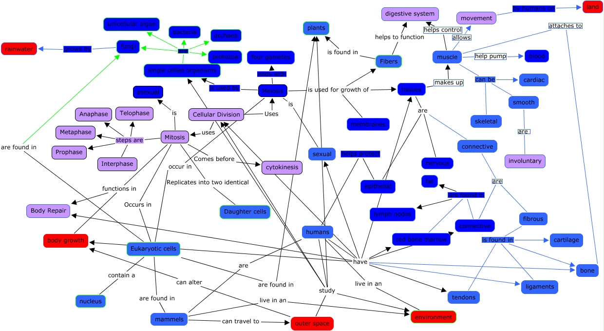 This Concept Map, created with IHMC CmapTools, has information related to: Pasciak_System Map, Cellular Division Uses Meiosis, connective are found in fat, humans have tissues, muscle help pump blood, fibrous is found in bone, epithelial helps protect humans, connective are found in lymph nodes, Mitosis Replicates into two identical Daughter cells, Mitosis is asexual, tissues are epithelial, Meiosis is sexual, humans study plants, Eukaryotic cells are found in mammels, Mitosis steps are Prophase, Cellular Division uses Mitosis, Mitosis functions in Body Repair, Eukaryotic cells contain a nucleus, single celled organisms are unicellular algae, Mitosis steps are Interphase, muscle can be smooth