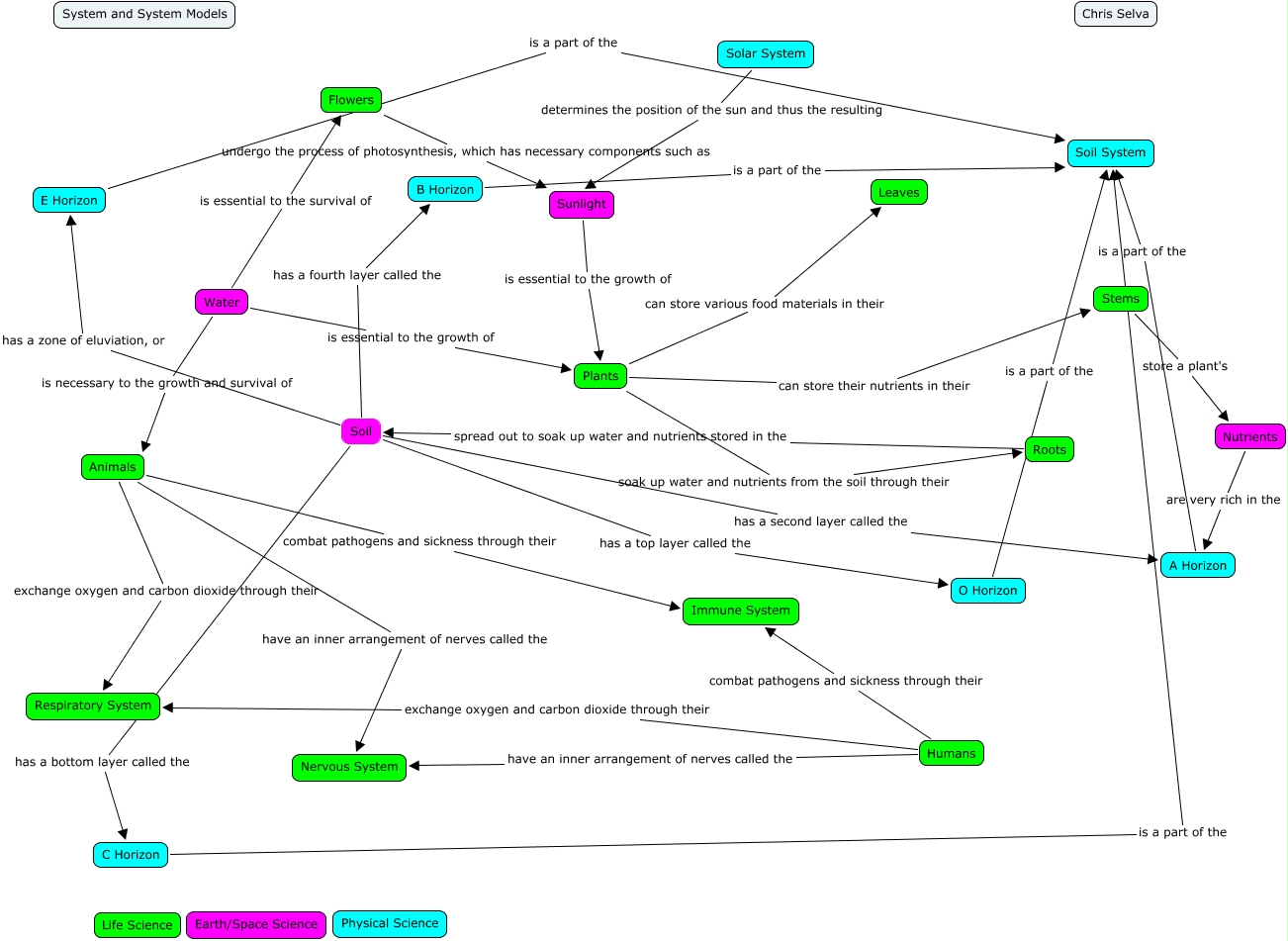 This Concept Map, created with IHMC CmapTools, has information related to: CAPSTONE CMAP 2, Water is essential to the growth of Plants, Animals combat pathogens and sickness through their Immune System, Plants soak up water and nutrients from the soil through their Roots, Plants can store their nutrients in their Stems, Animals have an inner arrangement of nerves called the Nervous System, Soil has a fourth layer called the B Horizon, Solar System determines the position of the sun and thus the resulting Sunlight, O Horizon is a part of the Soil System, Nutrients are very rich in the A Horizon, Water is necessary to the growth and survival of Animals, Soil has a top layer called the O Horizon, A Horizon is a part of the Soil System, Roots spread out to soak up water and nutrients stored in the Soil, Water is essential to the survival of Flowers, E Horizon is a part of the Soil System, Stems store a plant's Nutrients, Flowers undergo the process of photosynthesis, which has necessary components such as Sunlight, Sunlight is essential to the growth of Plants, Soil has a bottom layer called the C Horizon, C Horizon is a part of the Soil System