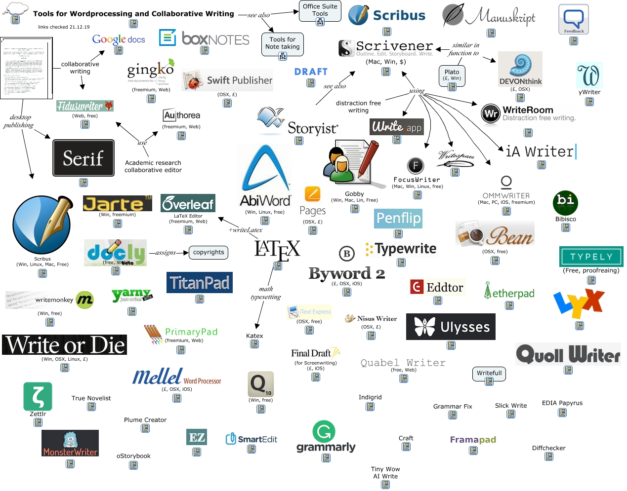 This Concept Map, created with IHMC CmapTools, has information related to: Wordprocessing, +writeLatex LaTeX Editor (freemium, Web), distraction free writing using, desktop publishing Scribus (Win, Linux, Mac, Free), Academic research collaborative editor use (freemium, Web), see also (Mac, Win, $), Plato (£, Win) similar in function to (£, OSX), Academic research collaborative editor use (Web, free), distraction free writing using, collaborative writing (Web, free), distraction free writing using (Mac, Win, $), distraction free writing using (Mac, PC, iOS, freemium), distraction free writing using (Mac, Win, Linux, free), (free, Web) assigns copyrights, distraction free writing using, Tools for Wordprocessing and Collaborative Writing see also Office Suite Tools, math typesetting Katex, Plato (£, Win) similar in function to (Mac, Win, $), Tools for Wordprocessing and Collaborative Writing see also Tools for Note taking, collaborative writing, desktop publishing