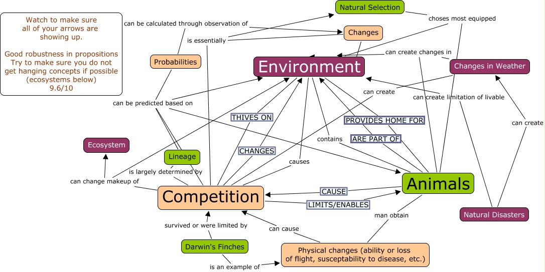 This Concept Map, created with IHMC CmapTools, has information related to: Anna Wright - Natural Selection, Darwin's Finches survived or were limited by Competition, Probabilities can be predicted based on Competition, Environment PROVIDES HOME FOR Animals, Environment THIVES ON Competition, Probabilities can be predicted based on Lineage, Changes in Weather can create Competition, Changes is essentially Natural Selection, Physical changes (ability or loss of flight, susceptability to disease, etc.) can cause Competition, Probabilities can be predicted based on Environment, Changes in Environment, Changes in Weather can create changes in Animals, Animals ARE PART OF Environment, Competition can change makeup of Environment, Animals CAUSE Competition, Environment choses most equipped Animals, Natural Disasters can create limitation of livable Environment, Darwin's Finches is an example of Physical changes (ability or loss of flight, susceptability to disease, etc.), Competition can change makeup of Ecosystem, Competition LIMITS/ENABLES Animals, Probabilities can be calculated through observation of Changes