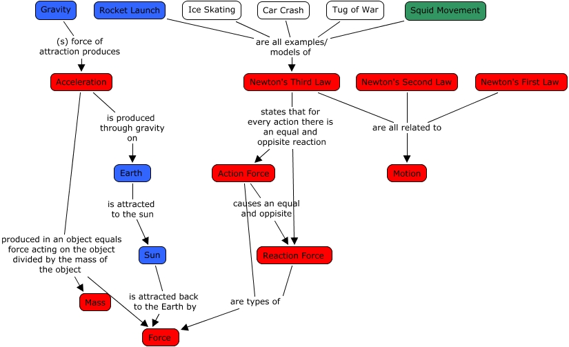 This Concept Map, created with IHMC CmapTools, has information related to: Grasty Systems, Car Crash are all examples/ models of Newton's Third Law, Action Force are types of Force, Newton's Third Law states that for every action there is an equal and oppisite reaction Reaction Force, Newton's Third Law states that for every action there is an equal and oppisite reaction Action Force, Action Force causes an equal and oppisite Reaction Force, Tug of War are all examples/ models of Newton's Third Law, Newton's First Law are all related to Motion, Acceleration produced in an object equals force acting on the object divided by the mass of the object Force, Acceleration is produced through gravity on Earth, Gravity (s) force of attraction produces Acceleration, Acceleration produced in an object equals force acting on the object divided by the mass of the object Mass, Squid Movement are all examples/ models of Newton's Third Law, Earth is attracted to the sun Sun, Ice Skating are all examples/ models of Newton's Third Law, Newton's Third Law are all related to Motion, Reaction Force are types of Force, Newton's Second Law are all related to Motion, Sun is attracted back to the Earth by Force, Rocket Launch are all examples/ models of Newton's Third Law