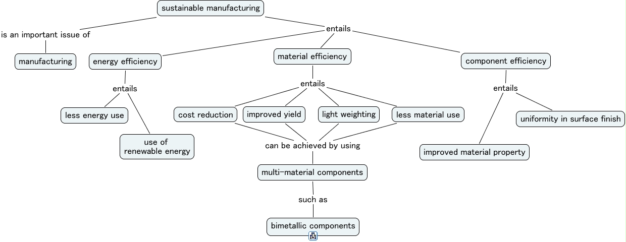 このコンセプトマップに関連する情報: sustainable manufacturing, cost reduction can be achieved by using multi-material components, light weighting can be achieved by using multi-material components, material efficiency entails improved yield, sustainable manufacturing entails energy efficiency, less material use can be achieved by using multi-material components, material efficiency entails light weighting, sustainable manufacturing entails component efficiency, multi-material components such as bimetallic components, improved yield can be achieved by using multi-material components, component efficiency entails improved material property, material efficiency entails less material use, sustainable manufacturing entails material efficiency, energy efficiency entails use of renewable energy, sustainable manufacturing is an important issue of manufacturing, material efficiency entails cost reduction, component efficiency entails uniformity in surface finish, energy efficiency entails less energy use