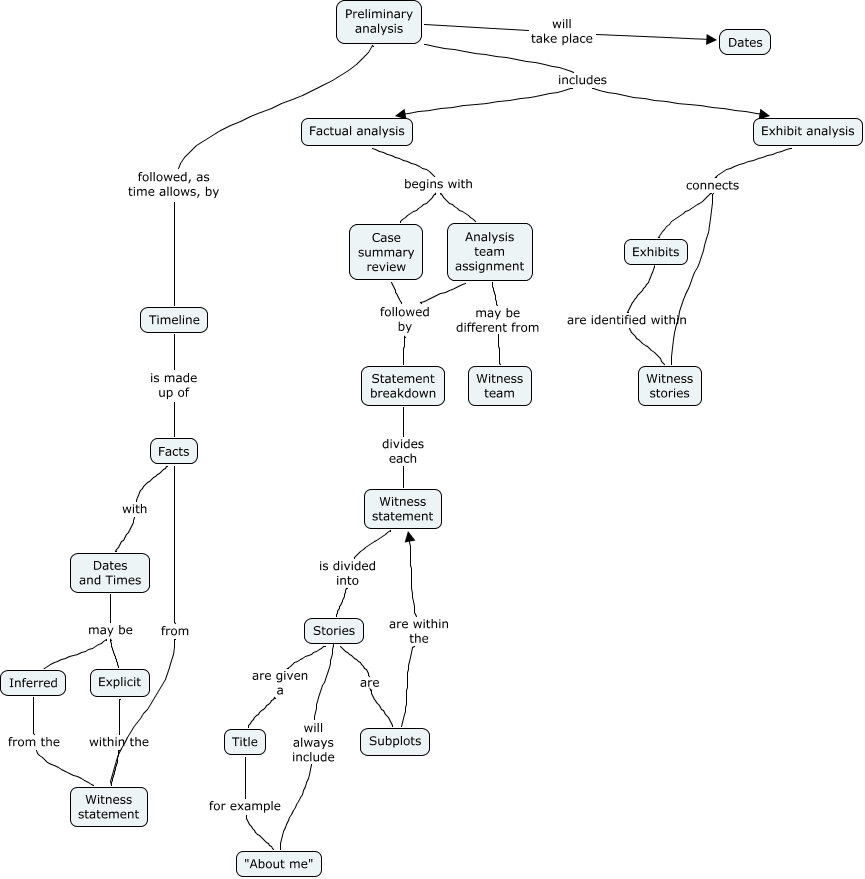 This Concept Map, created with IHMC CmapTools, has information related to: Preliminary Factual Analysis, Stories are Subplots, Preliminary analysis followed, as time allows, by Timeline, Dates and Times may be Explicit, Inferred from the Witness statement, Factual analysis begins with Analysis team assignment, Factual analysis begins with Case summary review, Exhibits are identified within Witness stories, Preliminary analysis will take place Dates, Analysis team assignment followed by Statement breakdown, Witness statement is divided into Stories, Preliminary analysis includes Exhibit analysis, Exhibit analysis connects Exhibits, Facts with Dates and Times, Exhibit analysis connects Witness stories, Stories are given a Title, Case summary review followed by Statement breakdown, Stories will always include "About me", Facts from Witness statement, Dates and Times may be Inferred, Statement breakdown divides each Witness statement
