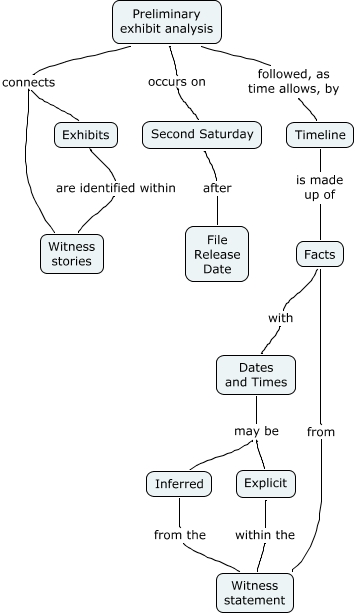 This Concept Map, created with IHMC CmapTools, has information related to: Preliminary Exhibit Analysis, Dates and Times may be Inferred, Preliminary exhibit analysis occurs on Second Saturday, Exhibits are identified within Witness stories, Inferred from the Witness statement, Facts with Dates and Times, Preliminary exhibit analysis connects Witness stories, Dates and Times may be Explicit, Facts from Witness statement, Timeline is made up of Facts, Explicit within the Witness statement, Preliminary exhibit analysis followed, as time allows, by Timeline, Second Saturday after File Release Date, Preliminary exhibit analysis connects Exhibits