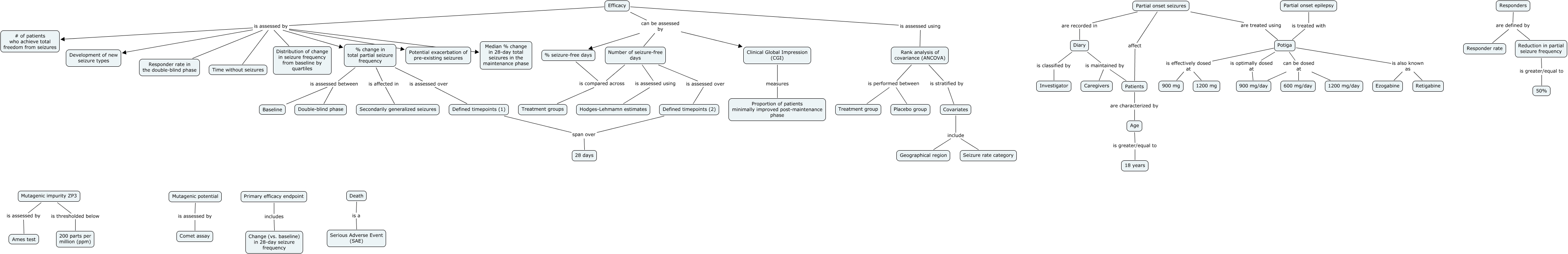This Concept Map, created with IHMC CmapTools, has information related to: Potiga-review_relationships, % seizure-free days is compared across Treatment groups, Efficacy is assessed by Development of new seizure types, Age is greater/equal to 18 years, Potiga can be dosed at 1200 mg/day, Efficacy is assessed by Time without seizures, Clinical Global Impression (CGI) measures Proportion of patients minimally improved post-maintenance phase, Potiga is optimally dosed at 900 mg/day, Diary is maintained by Patients, Efficacy is assessed by Potential exacerbation of pre-existing seizures, Primary efficacy endpoint includes Change (vs. baseline) in 28-day seizure frequency, Efficacy is assessed by Responder rate in the double-blind phase, % change in total partial seizure frequency is assessed between Baseline, Potiga is also known as Ezogabine, Efficacy can be assessed by Number of seizure-free days, Defined timepoints (1) span over 28 days, Potiga is effectively dosed at 900 mg, Rank analysis of covariance (ANCOVA) is performed between Treatment group, Potiga is effectively dosed at 1200 mg, Partial onset epilepsy is treated with Potiga, Efficacy can be assessed by % seizure-free days