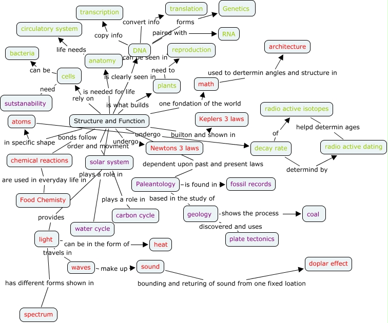 This Concept Map, created with IHMC CmapTools, has information related to: Structure and Function, sound bounding and returing of sound from one fixed loation doplar effect, waves make up sound, Paleantology based in the study of geology, Paleantology is found in fossil records, anatomy life needs circulatory system, chemical reactions are used in everyday life in Food Chemisty, Structure and Function undergo Newtons 3 laws, solar system plays a role in carbon cycle, light can be in the form of heat, Structure and Function is needed for life anatomy, atoms undergo decay rate, geology discovered and uses plate tectonics, Structure and Function dependent upon past and present laws Paleantology, Structure and Function in specific shape atoms, Structure and Function builton and shown in Keplers 3 laws, Structure and Function order and movment solar system, decay rate determind by radio active dating, Structure and Function rely on cells, solar system provides light, light travels in waves