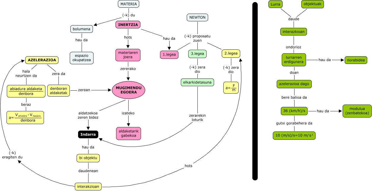 Este Cmap, tiene información relacionada con: azelerazioa, azelerazioa dago bere balioa da 36 (km/h)/s, elkarkidetasuna zerarekin loturik Indarra, Indarra hau da bi objektu, materiaren joera zererako MUGIMENDU EGOERA, objektuak daude interazkioan, interakzioan hots 2.legea, bi objektu daudenean interakzioan, <math xmlns="http://www.w3.org/1998/Math/MathML"> <mrow> <mfrac> <mtext> abiadura aldaketa </mtext> <mtext> denbora </mtext> </mfrac> </mrow> </math> beraz <math xmlns="http://www.w3.org/1998/Math/MathML"> <mrow> <mtext> a= </mtext> <mfrac> <mrow> <mmultiscripts> <mtext> V </mtext> <mtext> amaiera </mtext> <none/> </mmultiscripts> <mtext> - </mtext> <mmultiscripts> <mtext> V </mtext> <mtext> hasiera </mtext> <none/> </mmultiscripts> </mrow> <mtext> denbora </mtext> </mfrac> </mrow> </math>, 2.legea (-k) zera dio <math xmlns="http://www.w3.org/1998/Math/MathML"> <mrow> <mtext> a= </mtext> <mfrac> <mtext> F </mtext> <mtext> m </mtext> </mfrac> </mrow> </math>, NEWTON (-k) proposatu zuen 3.legea, denboran aldaketak zerean MUGIMENDU EGOERA, Lurra daude interazkioan, MATERIA (-k) du bolumena, 36 (km/h)/s hau da modulua (zenbatekoa), lurrarren erdigunera doan azelerazioa dago, INERTZIA hots materiaren joera, interakzioan (-k) eragiten du AZELERAZIOA, MATERIA (-k) du INERTZIA, interazkioan ondorioz lurrarren erdigunera, NEWTON (-k) proposatu zuen 1.legea