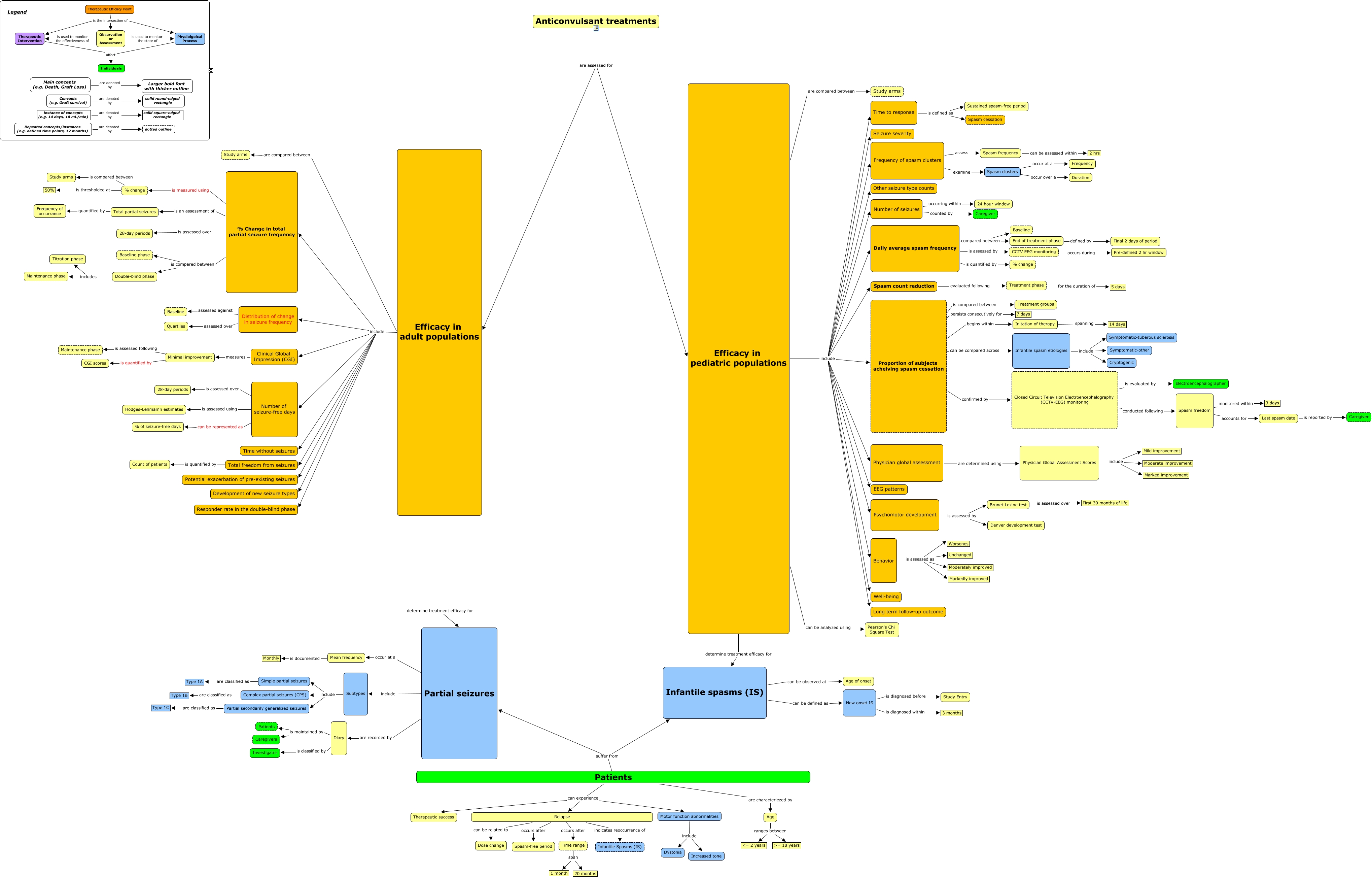 This Concept Map, created with IHMC CmapTools, has information related to: Anticonvulsant Efficacy Endpoints - v2, % Change in total partial seizure frequency is compared between Double-blind phase, Efficacy in pediatric populations determine treatment efficacy for Infantile spasms (IS), Therapeutic Efficacy Point is the intersection of Observation or Assessment, CCTV EEG monitoring occurs during Pre-defined 2 hr window, Relapse occurs after Time range, Double-blind phase includes Maintenance phase, Efficacy in pediatric populations include Seizure severity, Closed Circuit Television Electroencephalography (CCTV-EEG) monitoring is evaluated by Electroencephalographer, Patients can experience Therapeutic success, Diary is classified by Investigator, Simple partial seizures are classified as Type 1A, Subtypes include Simple partial seizures, Spasm freedom monitored within 3 days, Efficacy in pediatric populations include Psychomotor development, Mean frequency is documented Monthly, Concepts (e.g. Graft survival) are denoted by solid round-edged rectangle, Time to response is defined as Spasm cessation, Distribution of change in seizure frequency assessed against Baseline, Number of seizures counted by Caregiver, Partial secondarily generalized seizures are classified as Type 1C