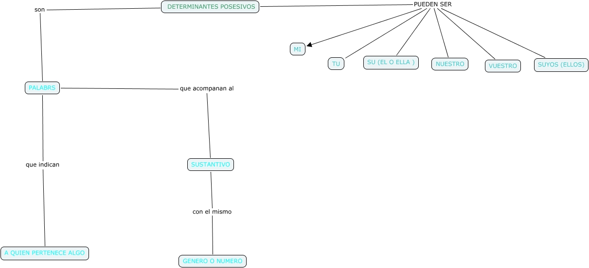 Este Cmap, tiene información relacionada con: determinantes posesivos, PALABRS que acompanan al SUSTANTIVO, DETERMINANTES POSESIVOS PUEDEN SER SUYOS (ELLOS), DETERMINANTES POSESIVOS PUEDEN SER VUESTRO, DETERMINANTES POSESIVOS PUEDEN SER TU, DETERMINANTES POSESIVOS PUEDEN SER MI, SUSTANTIVO con el mismo GENERO O NUMERO, DETERMINANTES POSESIVOS PUEDEN SER SU (EL O ELLA ), PALABRS que indican A QUIEN PERTENECE ALGO, DETERMINANTES POSESIVOS PUEDEN SER NUESTRO, DETERMINANTES POSESIVOS son PALABRS