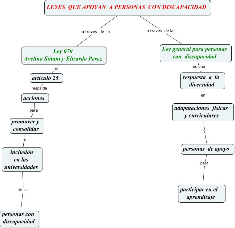 Este Cmap, tiene información relacionada con: LEYES QUE RESPLADAN A PERSONAS CON DISCAPACIDAD.cmap, inclusión en las universidades de las personas con discapacidad, personas de apoyo para participar en el aprendizaje, artículo 25 respalda acciones, adapataciones físicas y curriculares y personas de apoyo, LEYES QUE APOYAN A PERSONAS CON DISCAPACIDAD a través de la Ley general para personas con discapacidad, Ley general para personas con discapacidad es una respuesta a la diversidad, LEYES QUE APOYAN A PERSONAS CON DISCAPACIDAD a través de la Ley 070 Avelino Siñani y Elizardo Perez, Ley 070 Avelino Siñani y Elizardo Perez el artículo 25, promover y consolidar la inclusión en las universidades, respuesta a la diversidad en adapataciones físicas y curriculares, acciones para promover y consolidar