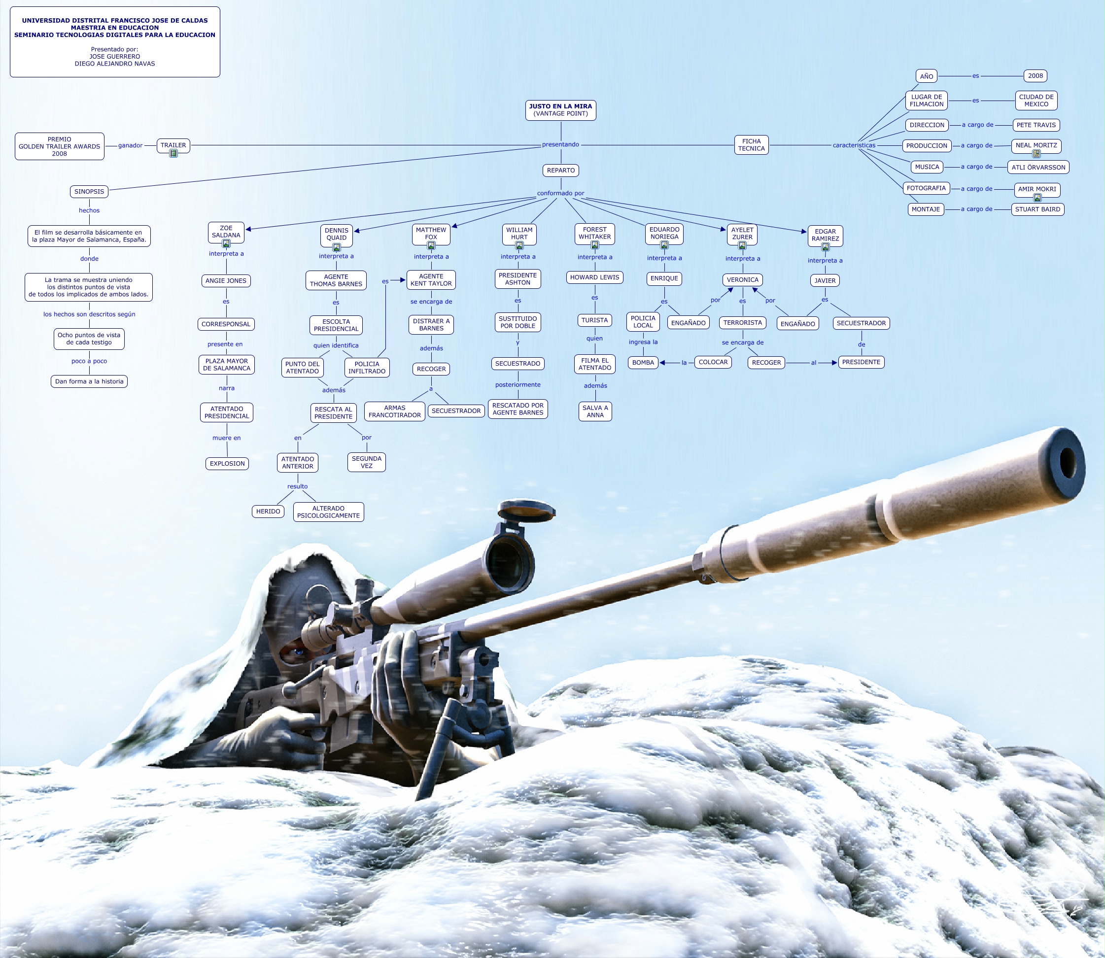 Este Cmap, tiene información relacionada con: JUSTOENLAMIRA.cmap, El film se desarrolla básicamente en la plaza Mayor de Salamanca, España. donde La trama se muestra uniendo los distintos puntos de vista de todos los implicados de ambos lados., PLAZA MAYOR DE SALAMANCA narra ATENTADO PRESIDENCIAL, ENGAÑADO por VERONICA, RECOGER a ARMAS FRANCOTIRADOR, WILLIAM HURT interpreta a PRESIDENTE ASHTON, FICHA TECNICA caracteristicas LUGAR DE FILMACION, ENRIQUE es POLICIA LOCAL, ESCOLTA PRESIDENCIAL quien identifica PUNTO DEL ATENTADO, FICHA TECNICA caracteristicas MONTAJE, ATENTADO PRESIDENCIAL muere en EXPLOSION, ESCOLTA PRESIDENCIAL quien identifica POLICIA INFILTRADO, PRESIDENTE ASHTON es SUSTITUIDO POR DOBLE, DIRECCION a cargo de PETE TRAVIS, TURISTA quien FILMA EL ATENTADO, SINOPSIS hechos El film se desarrolla básicamente en la plaza Mayor de Salamanca, España., TERRORISTA se encarga de COLOCAR, REPARTO conformado por EDUARDO NORIEGA, ENRIQUE es ENGAÑADO, JUSTO EN LA MIRA (VANTAGE POINT) presentando SINOPSIS, ZOE SALDANA interpreta a ANGIE JONES