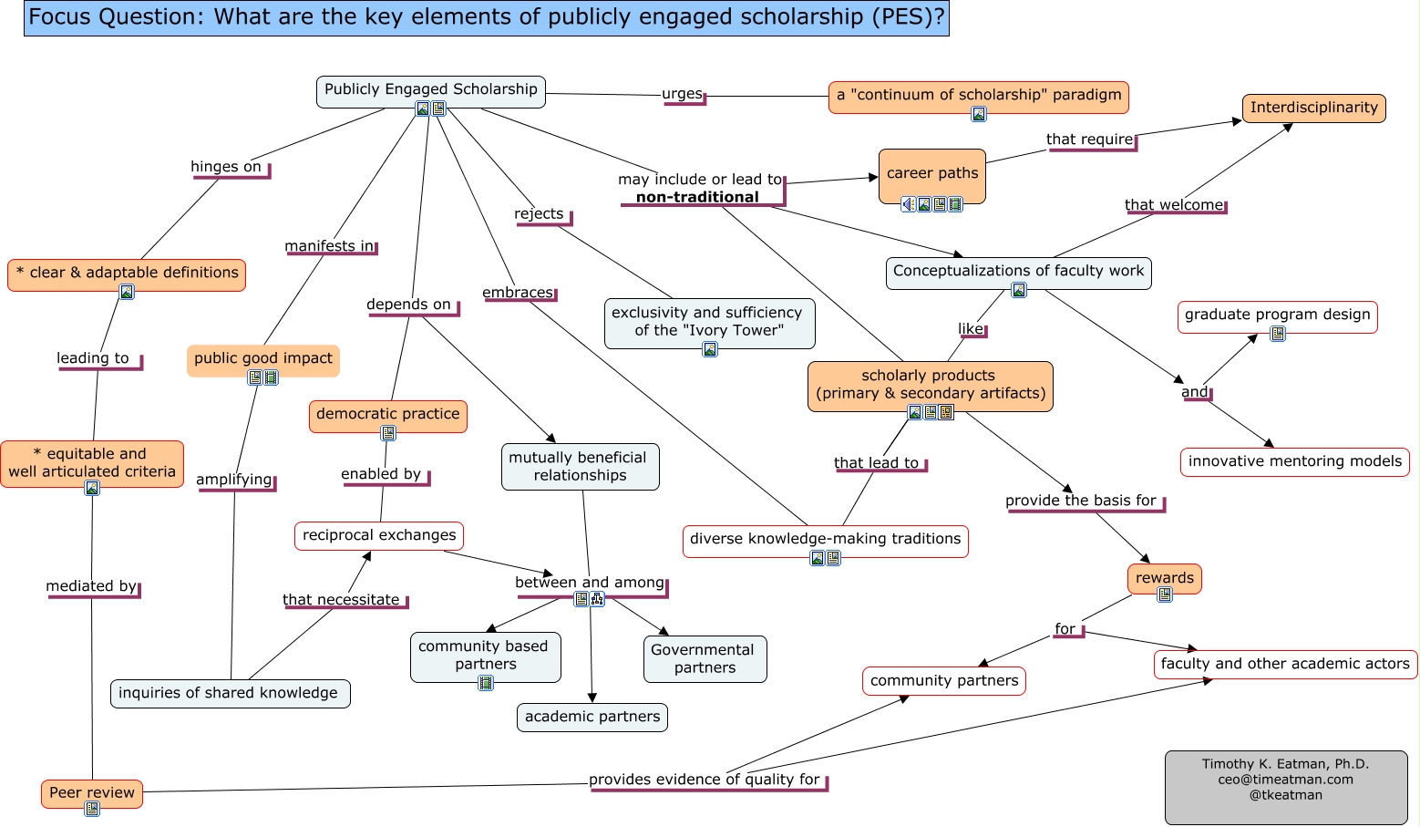 This Concept Map, created with IHMC CmapTools, has information related to: Publicly_Engaged_Scholarship_V8_local, scholarly products (primary & secondary artifacts) provide the basis for rewards, diverse knowledge-making traditions that lead to scholarly products (primary & secondary artifacts), mutually beneficial relationships between and among community based partners, Conceptualizations of faculty work that welcome Interdisciplinarity, rewards for faculty and other academic actors, rewards for community partners, mutually beneficial relationships between and among academic partners, Publicly Engaged Scholarship may include or lead to non-traditional Conceptualizations of faculty work, Publicly Engaged Scholarship urges a "continuum of scholarship" paradigm, inquiries of shared knowledge that necessitate reciprocal exchanges, Publicly Engaged Scholarship hinges on * clear & adaptable definitions, diverse knowledge-making traditions that lead to scholarly products (primary & secondary artifacts), reciprocal exchanges between and among Governmental partners, * equitable and well articulated criteria mediated by Peer review, Publicly Engaged Scholarship may include or lead to non-traditional career paths, Publicly Engaged Scholarship depends on mutually beneficial relationships, inquiries of shared knowledge amplifying public good impact, Peer review provides evidence of quality for community partners, Publicly Engaged Scholarship depends on democratic practice, reciprocal exchanges between and among community based partners