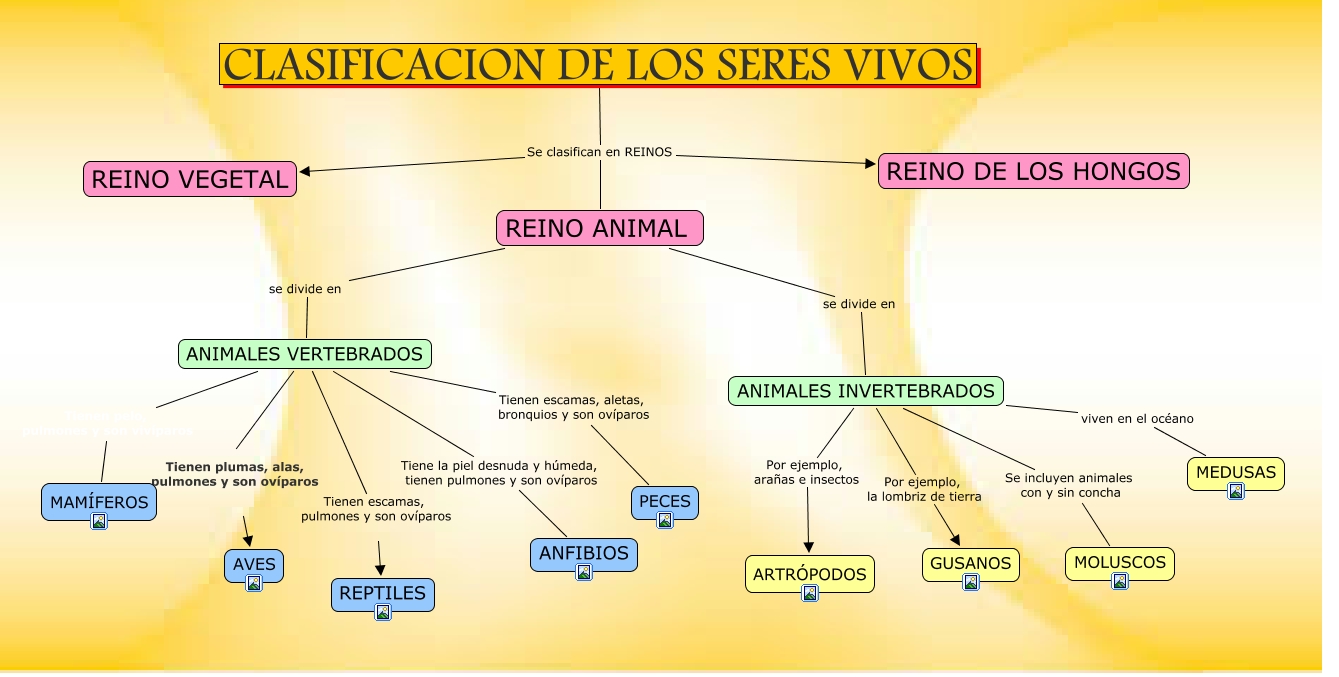 Este Cmap, tiene información relacionada con: CLASIFICACION DE LOS SERES VIVOS, CLASIFICACION DE LOS SERES VIVOS Se clasifican en REINOS REINO DE LOS HONGOS, ANIMALES VERTEBRADOS Tienen pelo, pulmones y son vivíparos MAMÍFEROS, ANIMALES VERTEBRADOS Tienen plumas, alas, pulmones y son ovíparos AVES, CLASIFICACION DE LOS SERES VIVOS Se clasifican en REINOS REINO ANIMAL, ANIMALES INVERTEBRADOS Se incluyen animales con y sin concha MOLUSCOS, CLASIFICACION DE LOS SERES VIVOS Se clasifican en REINOS REINO VEGETAL, ANIMALES VERTEBRADOS Tienen escamas, aletas, bronquios y son ovíparos PECES, ANIMALES INVERTEBRADOS Por ejemplo, la lombriz de tierra GUSANOS, ANIMALES INVERTEBRADOS Por ejemplo, arañas e insectos ARTRÓPODOS, REINO ANIMAL se divide en ANIMALES VERTEBRADOS, REINO ANIMAL se divide en ANIMALES INVERTEBRADOS, ANIMALES INVERTEBRADOS viven en el océano MEDUSAS, ANIMALES VERTEBRADOS Tienen escamas, pulmones y son ovíparos REPTILES, ANIMALES VERTEBRADOS Tiene la piel desnuda y húmeda, tienen pulmones y son ovíparos ANFIBIOS