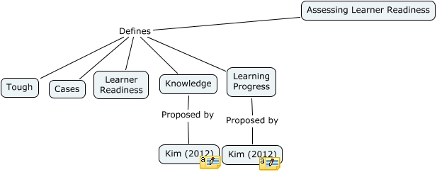 This Concept Map, created with IHMC CmapTools, has information related to: Assessing Learner REadiness, Assessing Learner Readiness Defines Knowledge, Assessing Learner Readiness Defines Tough, Assessing Learner Readiness Defines Cases, Assessing Learner Readiness Defines Learner Readiness, Knowledge Proposed by Kim (2012), Assessing Learner Readiness Defines Learning Progress, Learning Progress Proposed by Kim (2012)