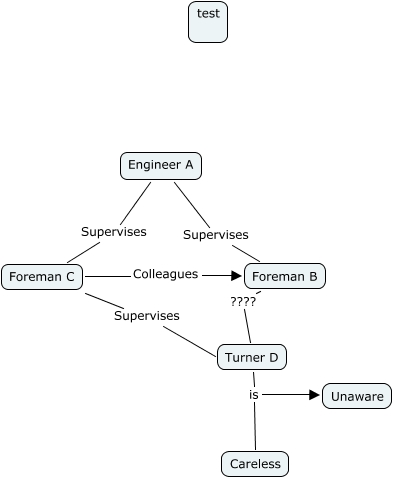 Dieses mit IHMC CmapTools erstellte CMap hat Informationen bezüglich: Initial_Map, Engineer A Supervises Foreman B, Engineer A Supervises Foreman C, Foreman C Supervises Turner D, Foreman C Colleagues Foreman B, Turner D is Unaware, Foreman B ???? Turner D, Turner D is Careless