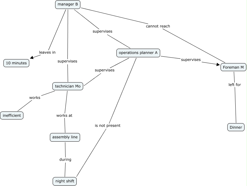 Dieses mit IHMC CmapTools erstellte CMap hat Informationen bezüglich: Minicase1_GroupF_initial, Foreman M left for Dinner, manager B supervises operations planner A, operations planner A is not present night shift, assembly line during night shift, manager B leaves in 10 minutes, operations planner A supervises technician Mo, technician Mo works inefficient, manager B cannot reach Foreman M, operations planner A supervises Foreman M, manager B supervises technician Mo, technician Mo works at assembly line