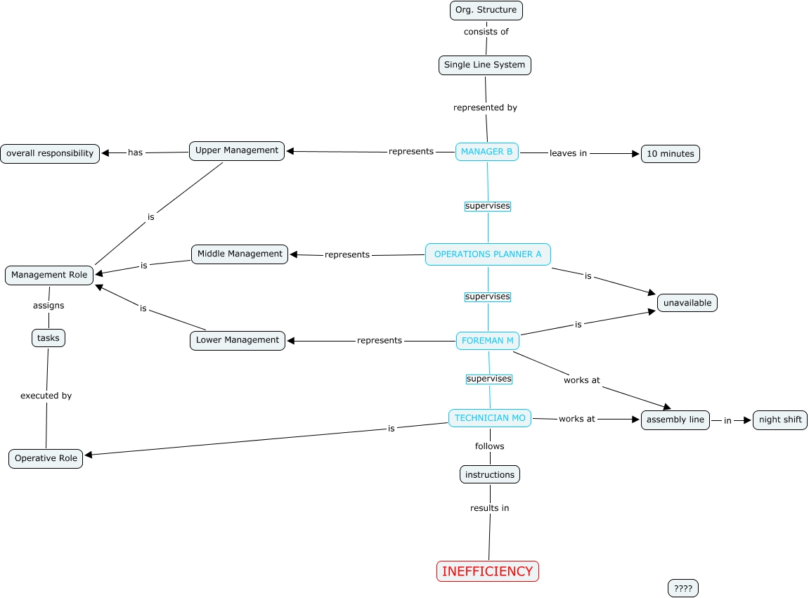 Dieses mit IHMC CmapTools erstellte CMap hat Informationen bezüglich: Minicase1_GroupF_final, assembly line in night shift, FOREMAN M represents Lower Management, OPERATIONS PLANNER A is unavailable, Single Line System represented by MANAGER B, tasks executed by Operative Role, OPERATIONS PLANNER A represents Middle Management, Management Role assigns tasks, Org. Structure consists of Single Line System, Middle Management is Management Role, MANAGER B represents Upper Management, TECHNICIAN MO follows instructions, MANAGER B leaves in 10 minutes, Upper Management has overall responsibility, OPERATIONS PLANNER A supervises FOREMAN M, FOREMAN M supervises TECHNICIAN MO, Upper Management is Management Role, FOREMAN M is unavailable, instructions results in INEFFICIENCY, MANAGER B supervises OPERATIONS PLANNER A, TECHNICIAN MO is Operative Role