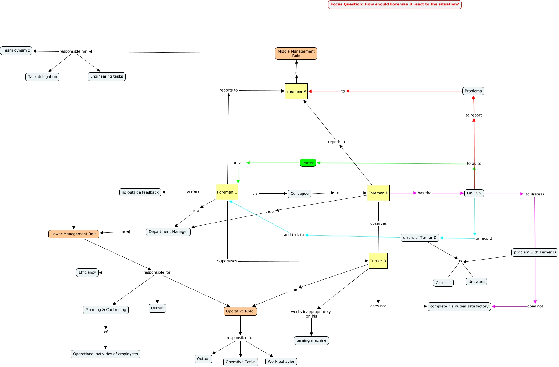 This Concept Map, created with IHMC CmapTools, has information related to: Day2_Map, Problems to Engineer A, Turner D does not complete his duties satisfactory, Lower Management Role responsible for Output, Lower Management Role responsible for Operative Role, Foreman C is a Department Manager, Planning & Controlling of Operational activities of employees, Lower Management Role responsible for Efficiency, Turner D is Unaware, OPTION to report Problems, OPTION to discuss problem with Turner D, Turner D is Careless, Turner D is an Operative Role, errors of Turner D is Careless, Operative Role responsible for Work behavior, Colleague to Foreman B, Foreman B has the OPTION, errors of Turner D is Unaware, Foreman C reports to Engineer A, Foreman B is a Department Manager, Operative Role responsible for Output