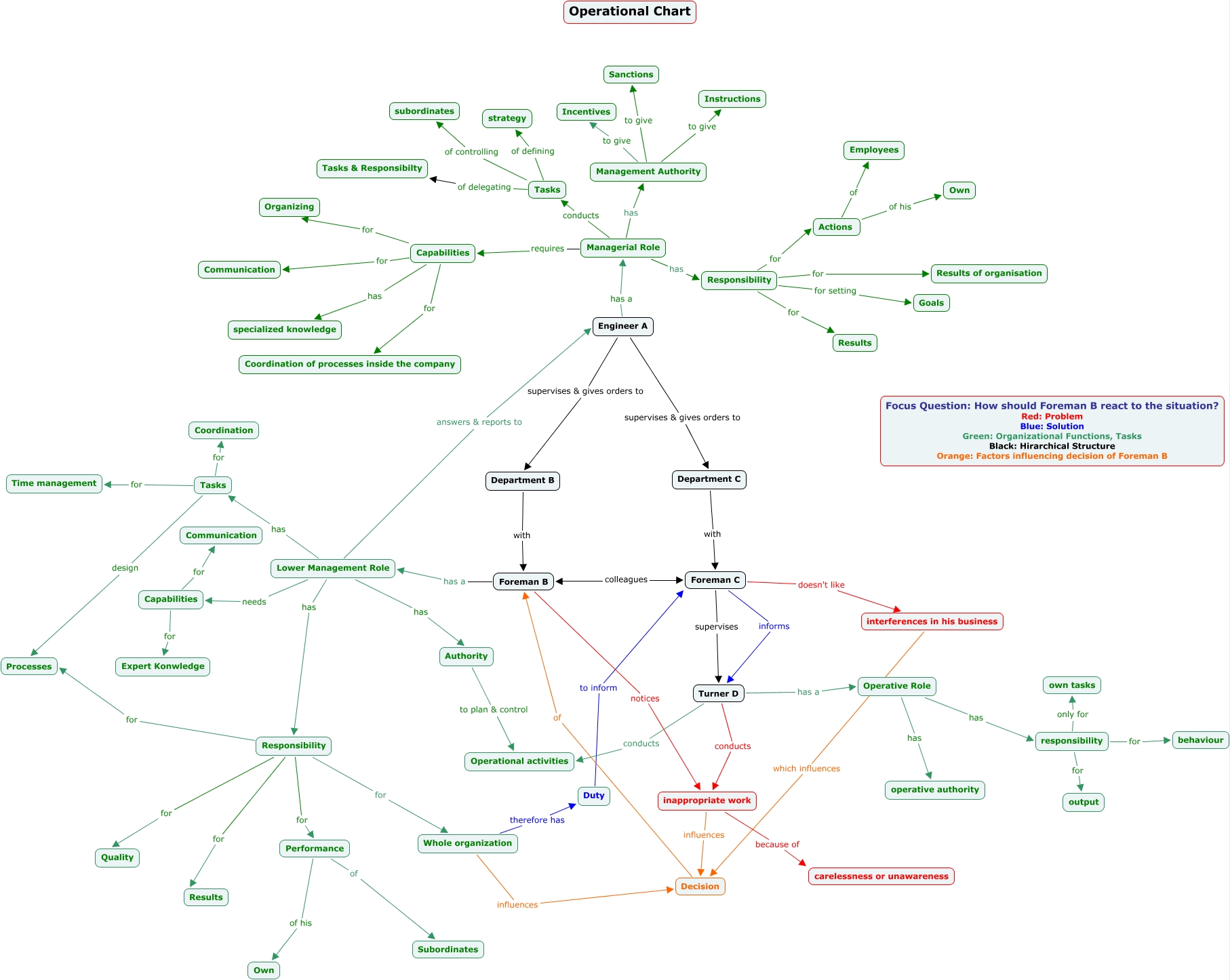 Dieses mit IHMC CmapTools erstellte CMap hat Informationen bezüglich: Merged Map_Case 2_Team C, inappropriate work influences Decision, Foreman B notices inappropriate work, Capabilities for Expert Konwledge, Foreman B has a Lower Management Role, Actions of his Own, responsibility for behaviour, Responsibility for Quality, Tasks of controlling subordinates, Management Authority to give Incentives, Turner D conducts inappropriate work, Responsibility for Whole organization, Capabilities for Coordination of processes inside the company, Responsibility for Results, Capabilities has specialized knowledge, Tasks for Coordination, Foreman C doesn't like interferences in his business, Operative Role has responsibility, Tasks design Processes, Tasks of delegating Tasks & Responsibilty, Responsibility for Actions
