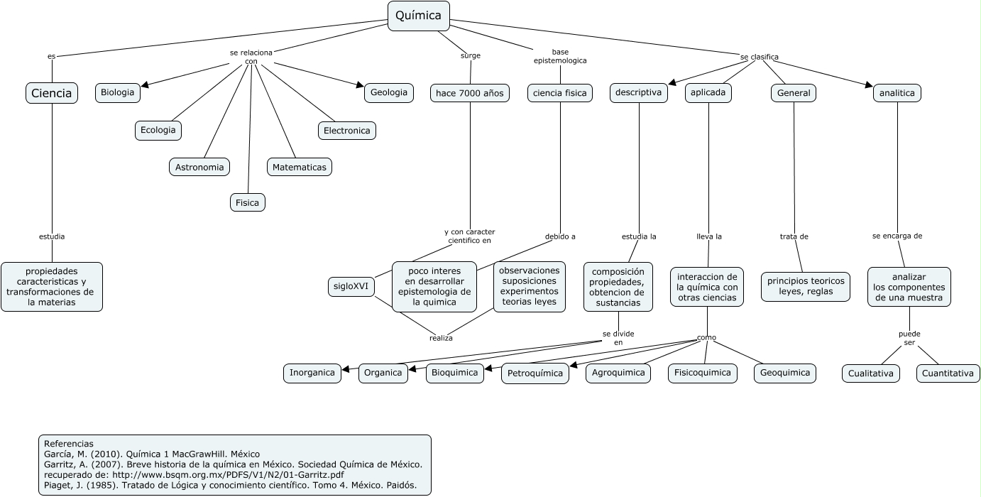 Este Cmap, tiene información relacionada con: FUNDAMENTOS QUIMICA, Química se relaciona con Astronomia, hace 7000 años y con caracter cientifico en sigloXVI, analizar los componentes de una muestra puede ser Cualitativa, analitica se encarga de analizar los componentes de una muestra, Química se relaciona con Biologia, Química se relaciona con Electronica, descriptiva estudia la composición propiedades, obtencion de sustancias, Química base epistemologica ciencia fisica, Química es Ciencia, Ciencia estudia propiedades caracteristicas y transformaciones de la materias, Química se clasifica aplicada, composición propiedades, obtencion de sustancias se divide en Organica, composición propiedades, obtencion de sustancias se divide en Inorganica, Química se relaciona con Geologia, interaccion de la química con otras ciencias como Geoquimica, Química se clasifica analitica, Química se clasifica General, interaccion de la química con otras ciencias como Fisicoquimica, Química se relaciona con Fisica, interaccion de la química con otras ciencias como Bioquimica
