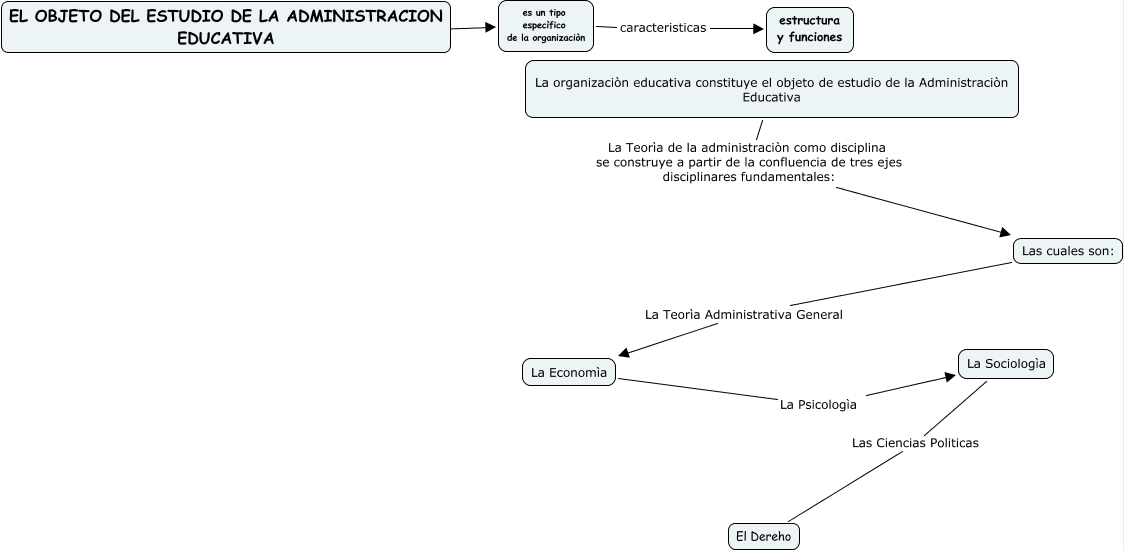 Este Cmap, tiene información relacionada con: EL OBJETO DEL ESTUDIO DE LA ADMINISTRACION, es un tipo especìfico de la organizaciòn caracteristicas estructura y funciones, La organizaciòn educativa constituye el objeto de estudio de la Administraciòn Educativa La Teorìa de la administraciòn como disciplina se construye a partir de la confluencia de tres ejes disciplinares fundamentales: Las cuales son:, La Sociologìa Las Ciencias Politicas El Dereho, Las cuales son: La Teorìa Administrativa General La Economìa, La Economìa La Psicologìa La Sociologìa, EL OBJETO DEL ESTUDIO DE LA ADMINISTRACION EDUCATIVA ???? es un tipo especìfico de la organizaciòn