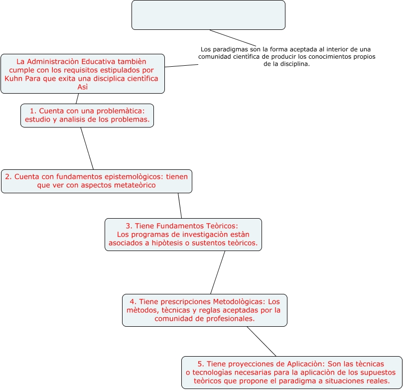 Este Cmap, tiene información relacionada con: LA NOCION DE PARADIGMA DE THOMAS KUHN, 3. Tiene Fundamentos Teòricos: Los programas de investigaciòn estàn asociados a hipòtesis o sustentos teòricos. 4. Tiene prescripciones Metodològicas: Los mètodos, tècnicas y reglas aceptadas por la comunidad de profesionales., La Administraciòn Educativa tambièn cumple con los requisitos estipulados por Kuhn Para que exita una disciplica cientìfica Asì Los paradigmas son la forma aceptada al interior de una comunidad cientìfica de producir los conocimientos propios de la disciplina., La Administraciòn Educativa tambièn cumple con los requisitos estipulados por Kuhn Para que exita una disciplica cientìfica Asì ???? 2. Cuenta con fundamentos epistemològicos: tienen que ver con aspectos metateòrico, 2. Cuenta con fundamentos epistemològicos: tienen que ver con aspectos metateòrico ???? 3. Tiene Fundamentos Teòricos: Los programas de investigaciòn estàn asociados a hipòtesis o sustentos teòricos., 4. Tiene prescripciones Metodològicas: Los mètodos, tècnicas y reglas aceptadas por la comunidad de profesionales. ???? 5. Tiene proyecciones de Aplicaciòn: Son las tècnicas o tecnologìas necesarias para la aplicaciòn de los supuestos teòricos que propone el paradigma a situaciones reales.